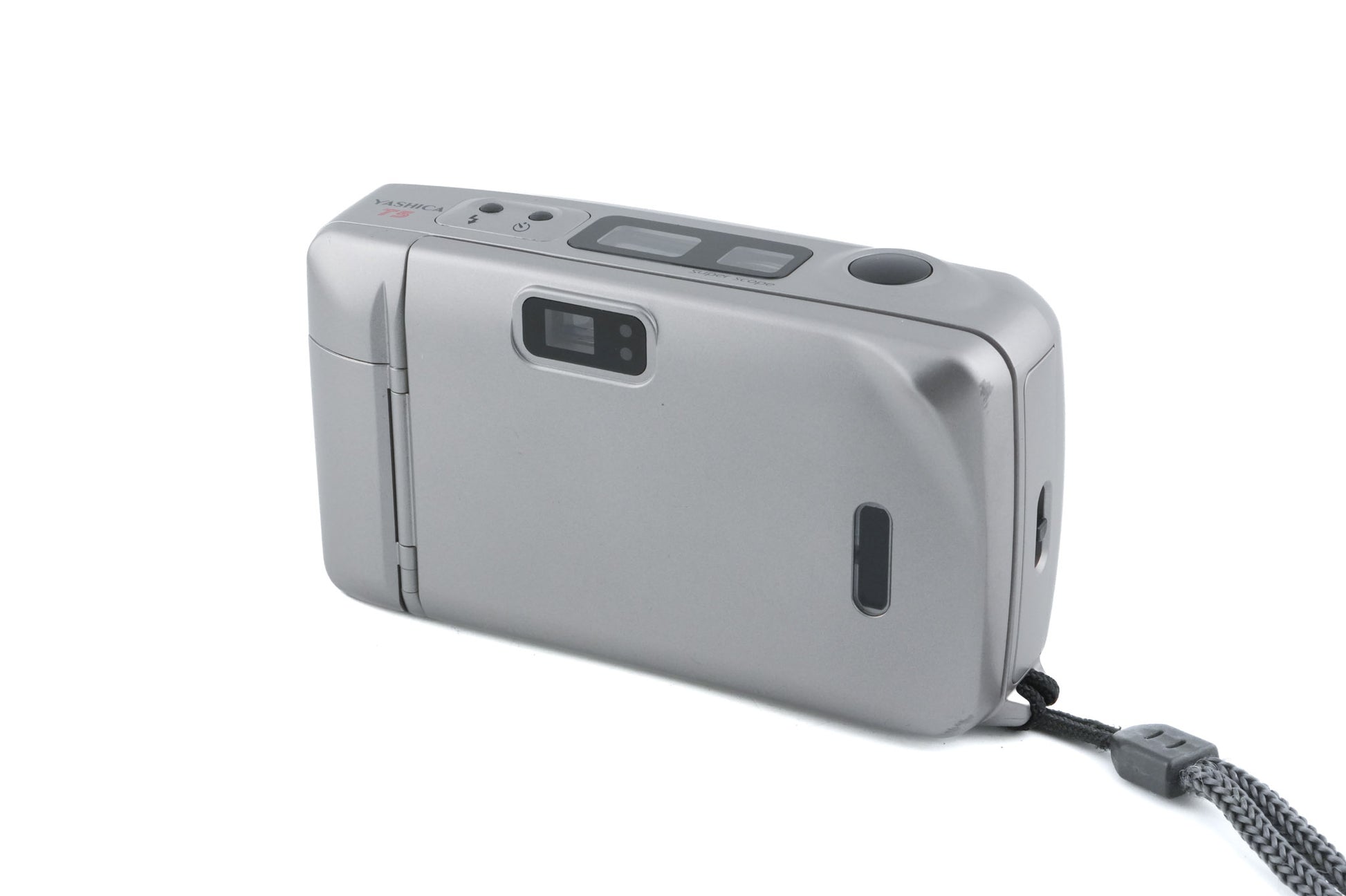 Autofocus 35mm compact camera released by Yashica in the 1990s. It features a waist-level "Super Scope" finder, light weatherproofing, and a Carl Zeiss Tessar lens. Plastic body available in silver & black.