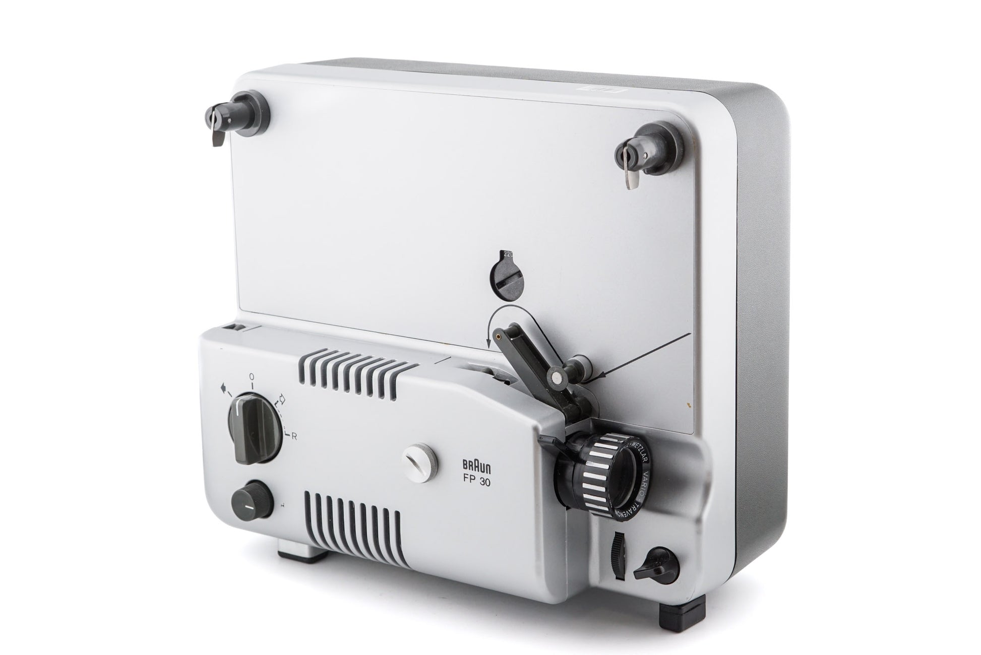 8mm film projector made by Braun introduced in 1972. It has a reel capacity of 120m, projection speeds of 6-18fps, and a 100 W, 12 V, FCR lamp. It does not have sound. Metal and plastic body available in grey.