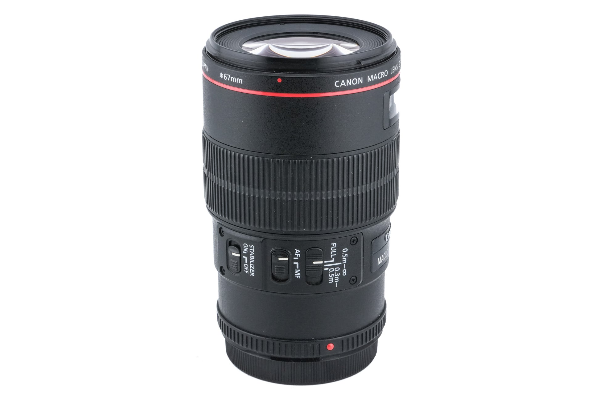 Autofocus macro/telephoto lens made for EF-mount DSLR cameras introduced by Canon. It is part of Canon's L series of professional lenses and has a weather-sealing gasket. It has an image stabilizer (IS) and an ultrasonic focusing motor (USM). Plastic and metal body available in black.