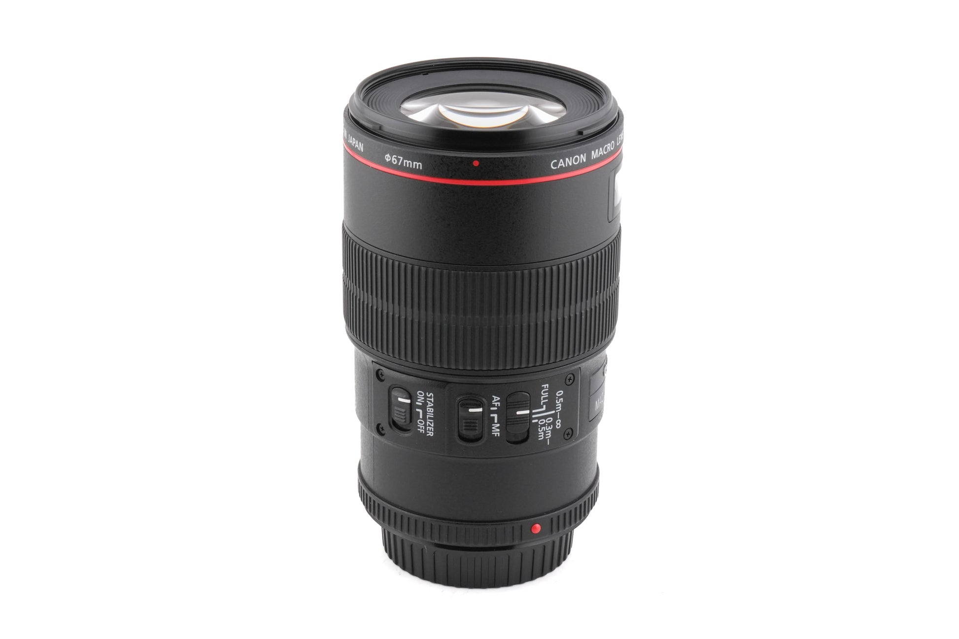 Autofocus macro/telephoto lens made for EF-mount DSLR cameras introduced by Canon. It is part of Canon's L series of professional lenses and has a weather-sealing gasket. It has an image stabilizer (IS) and an ultrasonic focusing motor (USM). Plastic and metal body available in black.