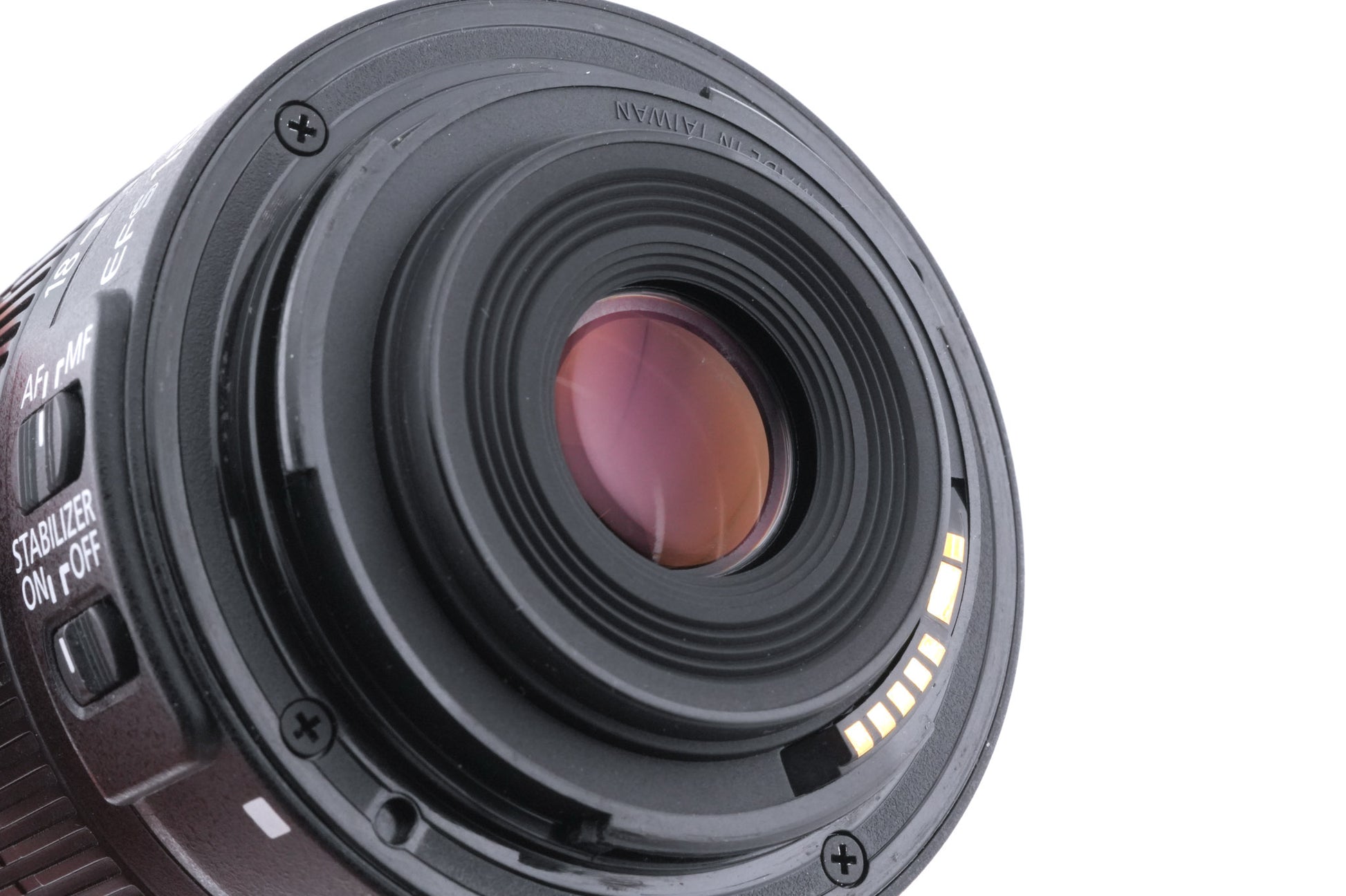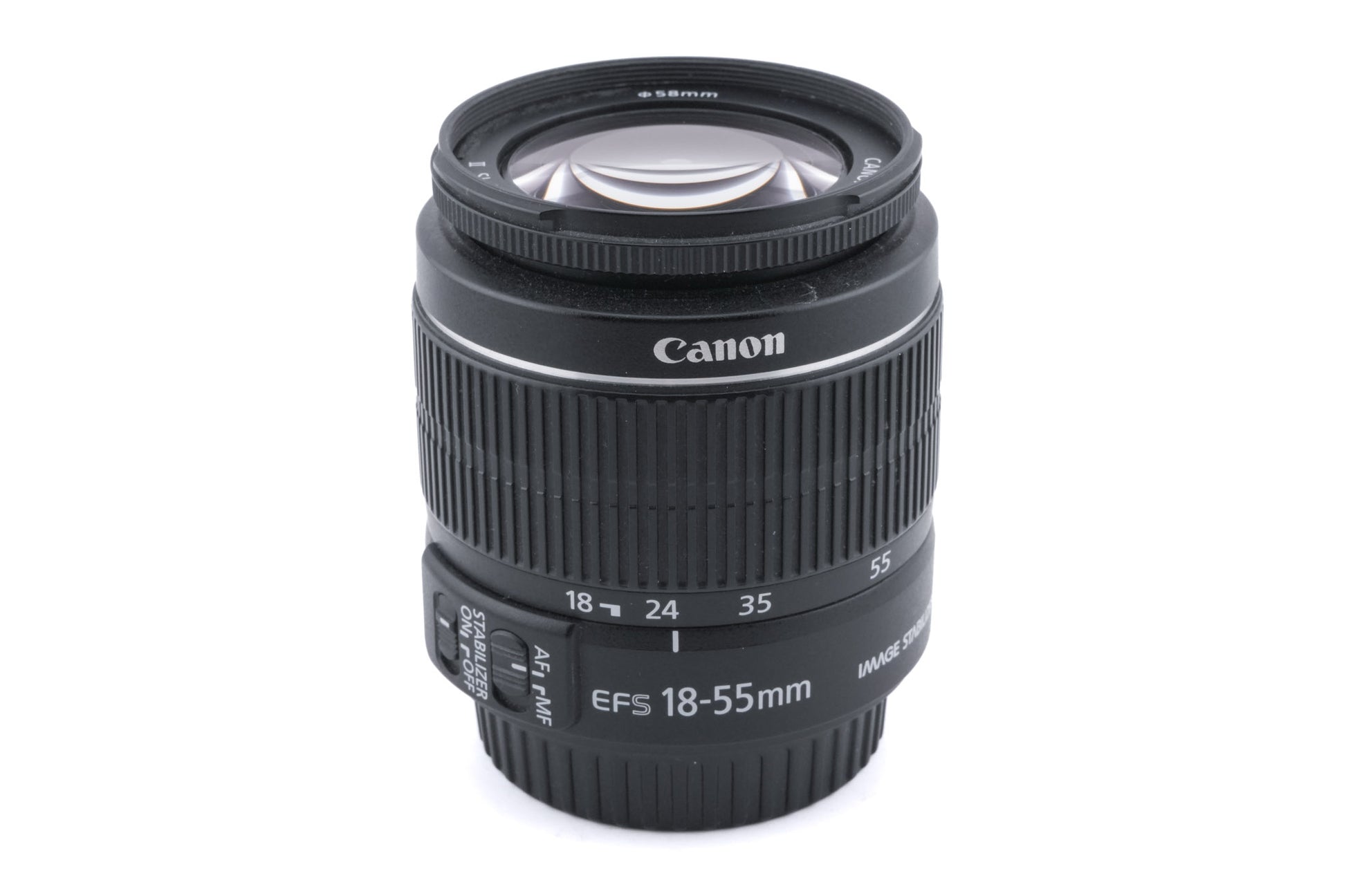 Autofocus zoom lens made for EF-S mount digital SLRs by Canon. It gives the equivalent field of view to a 27-82.5mm lens on full frame/35mm. This is the second EF-S kit lens that has image stabilization (IS). Plastic body available in black.