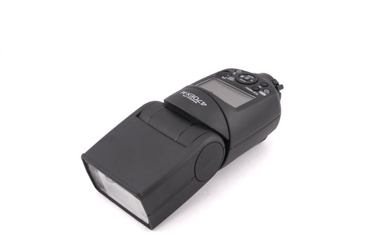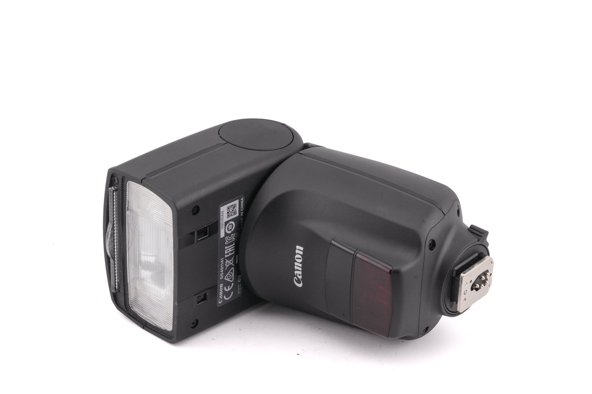 Flash made for EF/EF-S mount DSLR cameras by Canon. It has wireless receiver ability, a rotatable/tilting flash head, and a 24-105mm zoom head. Plastic body available in black.