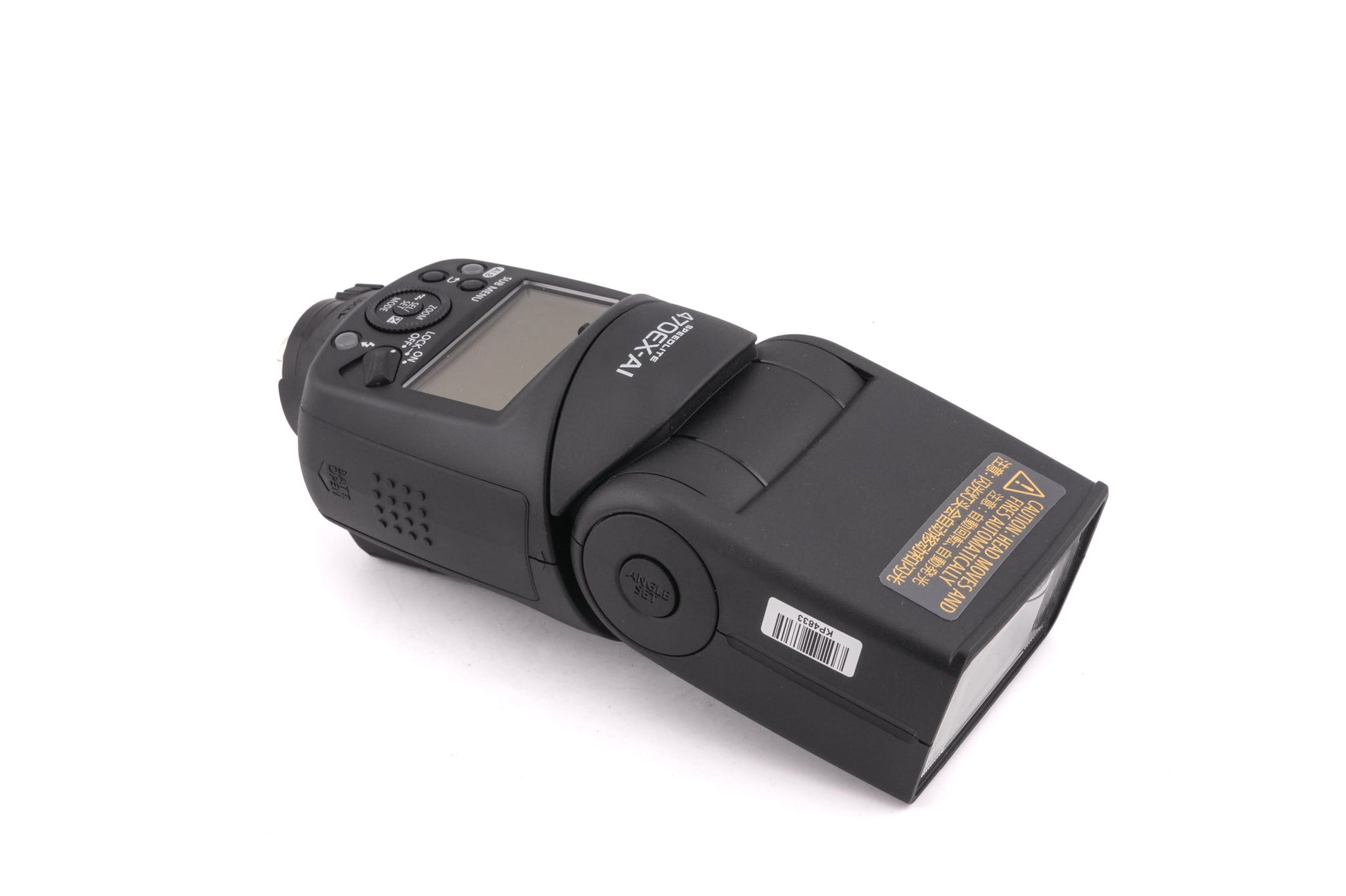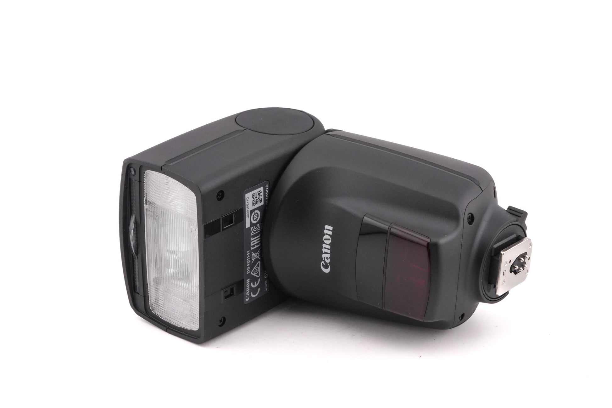 Flash made for EF/EF-S mount DSLR cameras by Canon. It has wireless receiver ability, a rotatable/tilting flash head, and a 24-105mm zoom head. Plastic body available in black.