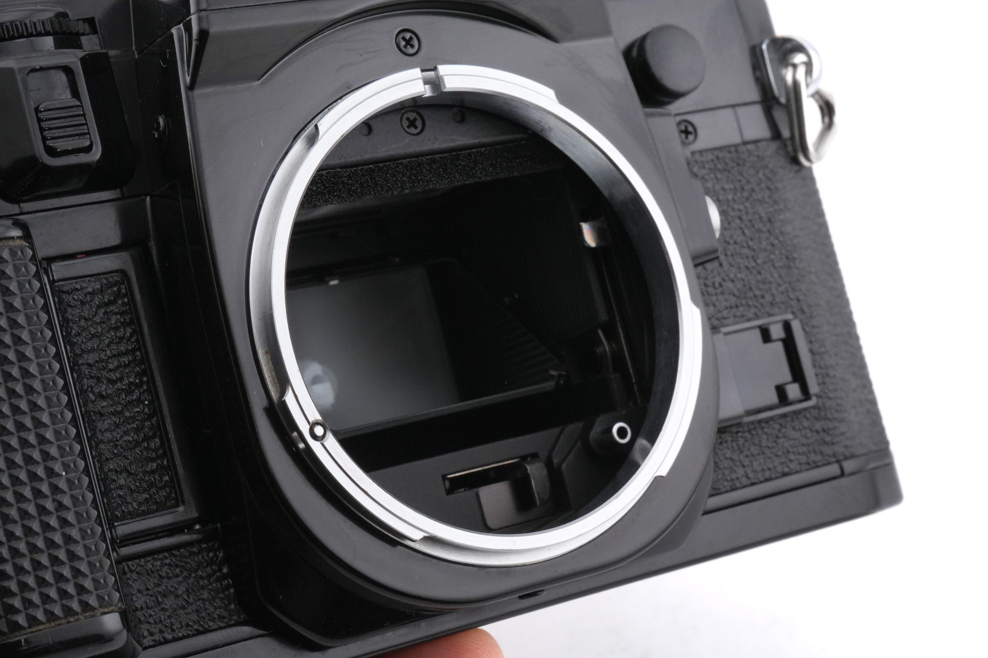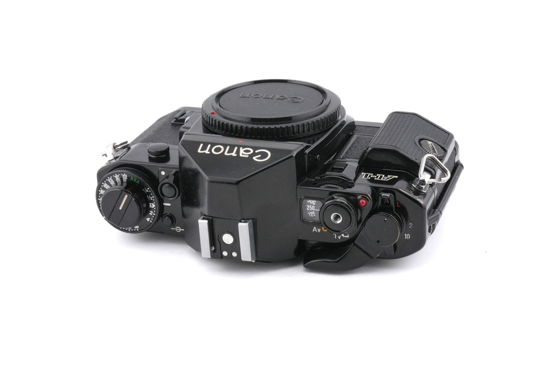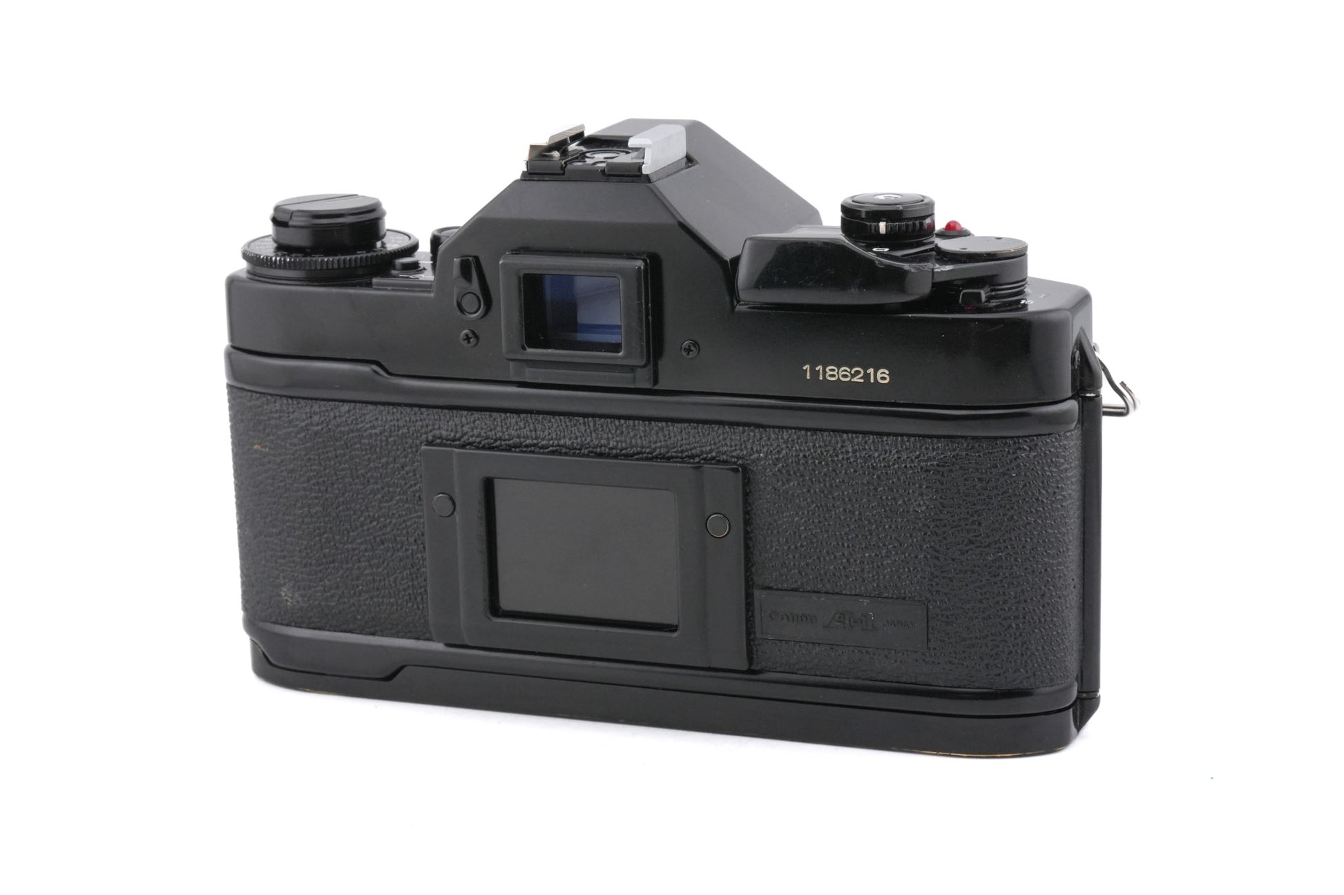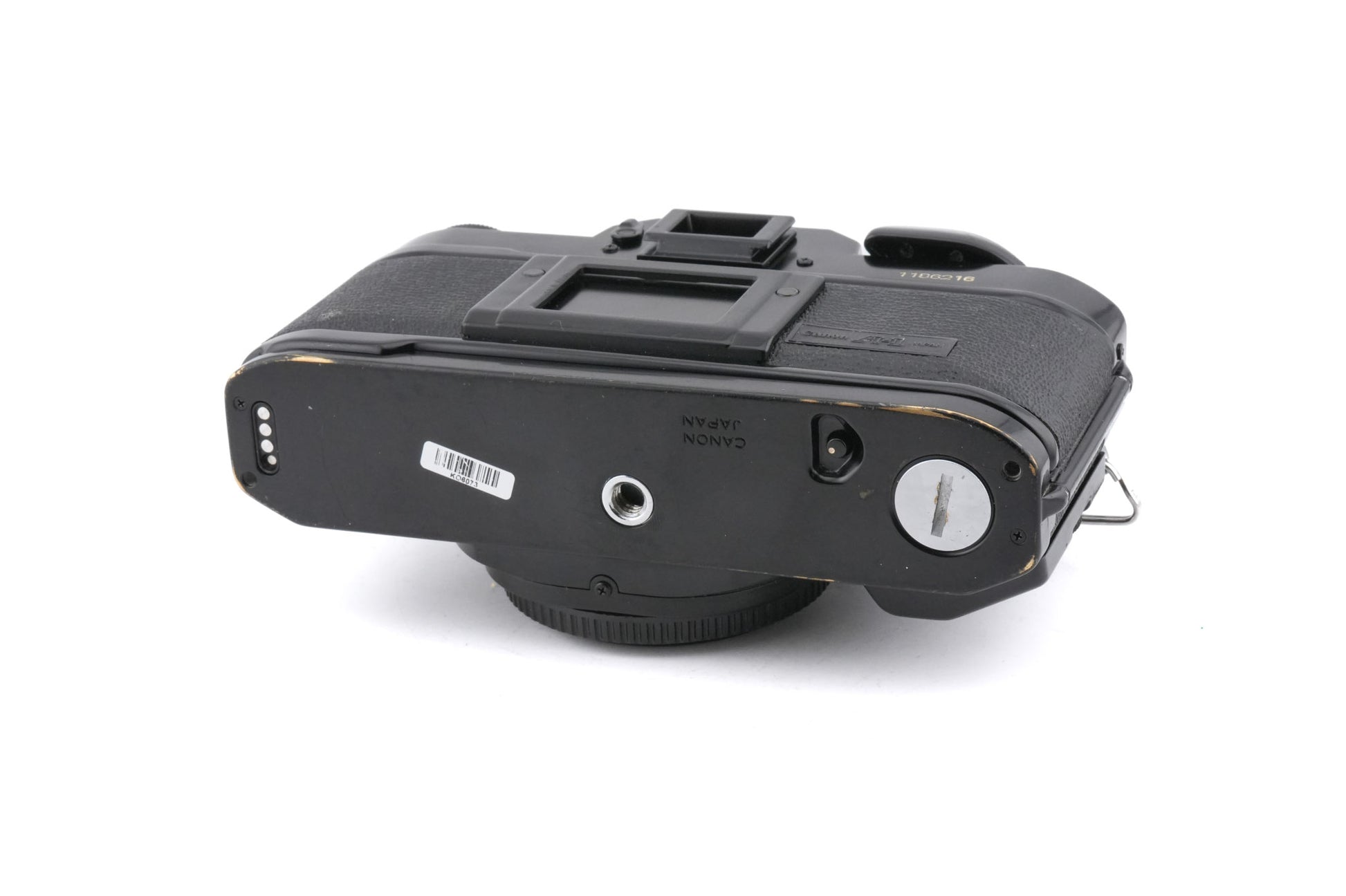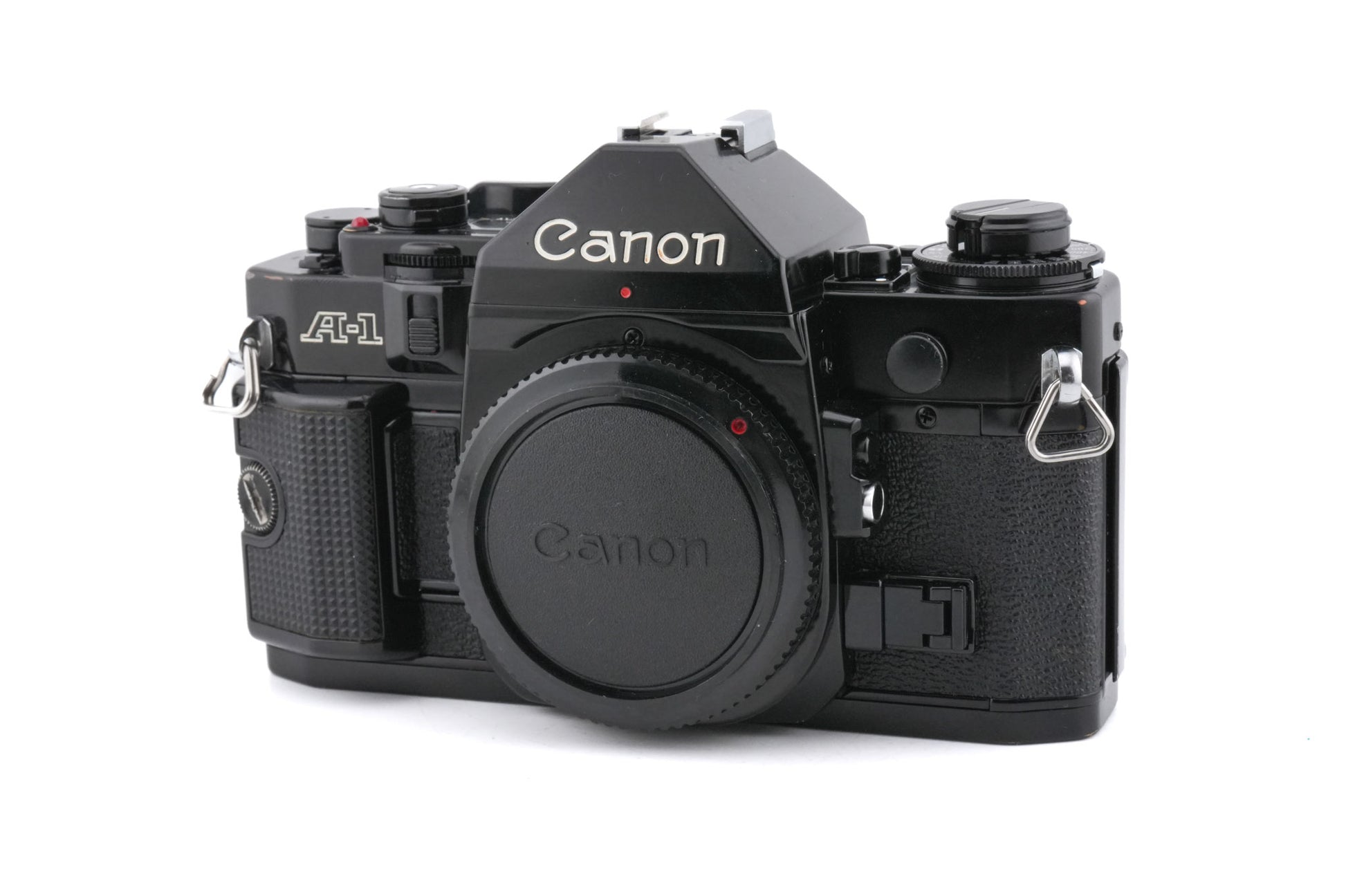Manual focus 35mm FD-mount SLR camera released by Canon in 1978. The A-1 features several different auto exposure modes such as shutter priority, aperture priority, and programmed fully-automatic mode. It was the first SLR camera to feature fully programmed auto exposure and the first to have the four standard exposure modes seen in modern digital cameras (PSAM). Metal body available in black.
