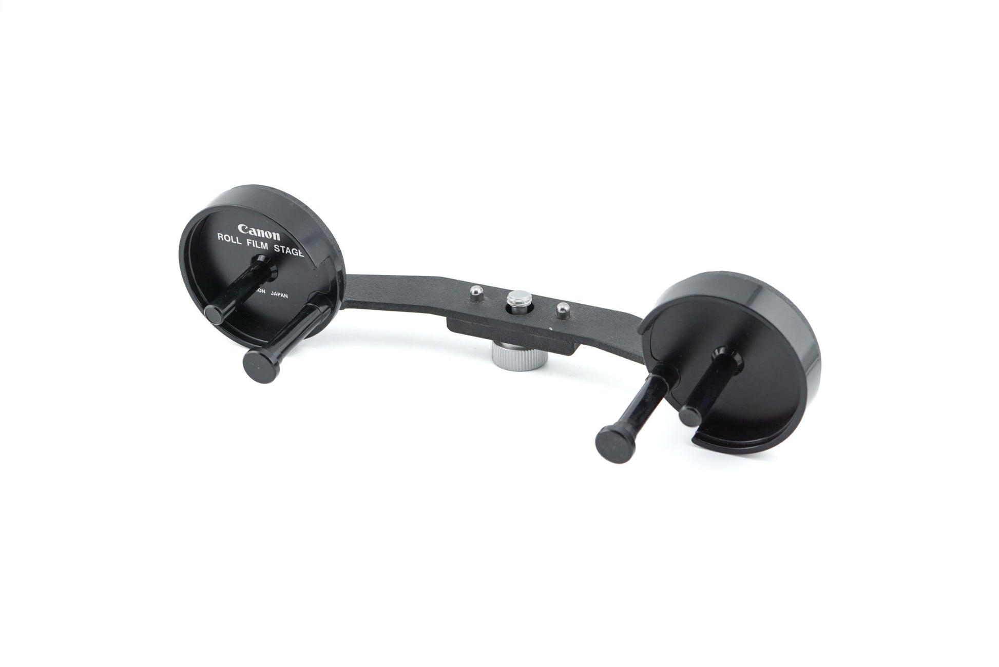 Used for holding both feeding and receiving rolls of film with Canon film copiers/duplicators like the Duplicator 35. Metal body in black finish.