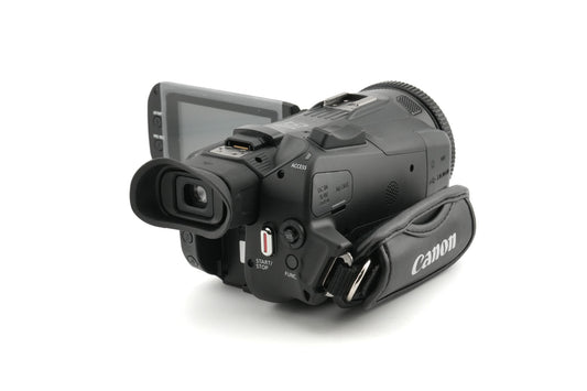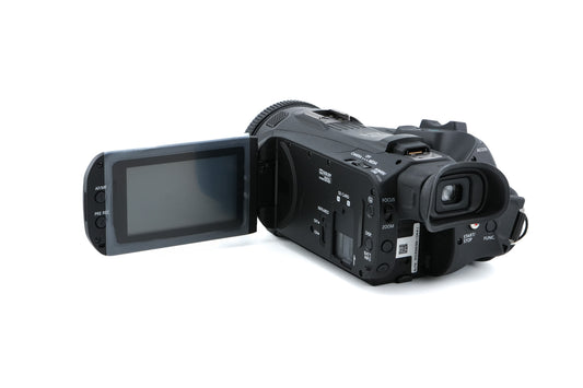 Autofocus digital handheld video camera made by Canon in 2017. Plastic/metal construction available in black.