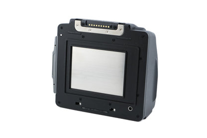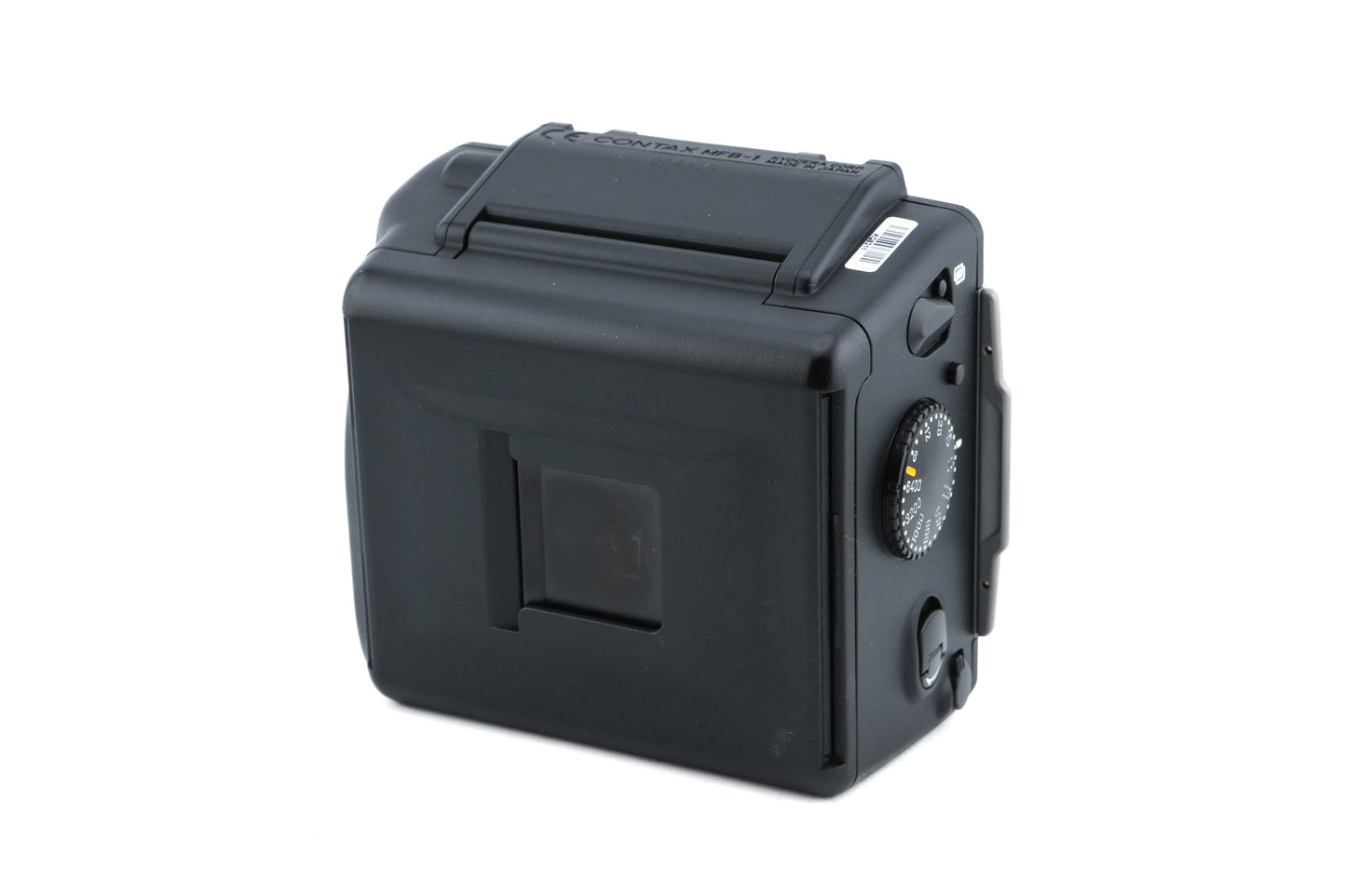120 film back made for 645 mount 120 SLRs by Contax. It works with both 120 and 220 film. Plastic/metal body available in black.