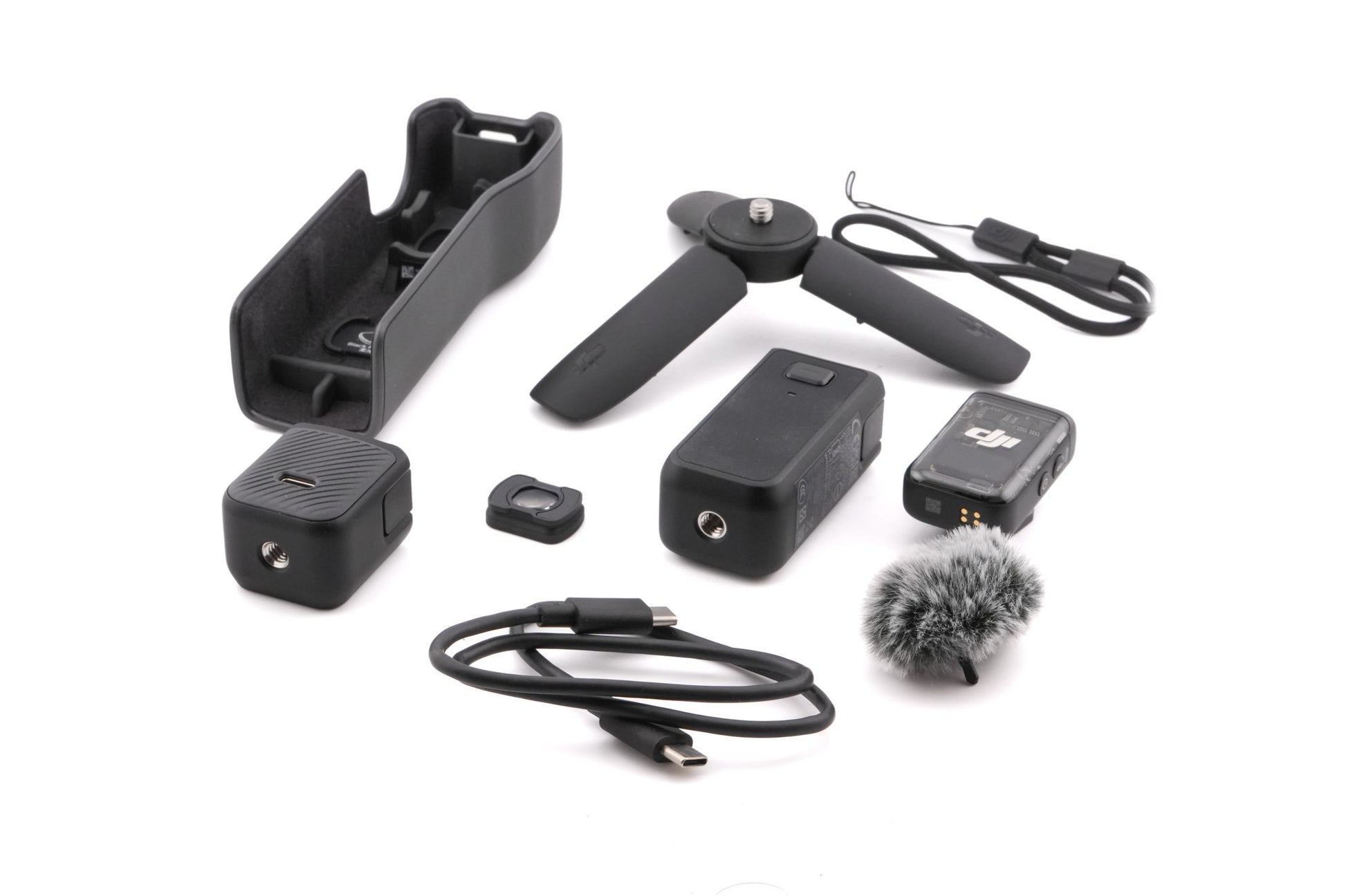 Autofocus digital compact camera released by DJI. It features a 3-axis stabilizer, which allows for smooth handheld video recordings. This Creator Combo kit includes the camera, a USB-C charging cable, a protective cover, a wrist strap, a pocket handle with 3/4" tripod socket, a wide-angle lens attachment, a Mic 2 with "dead cat" windscreen and clip magnet, a battery handle, a mini tripod, and a carrying bag. Plastic and metal body available in black.