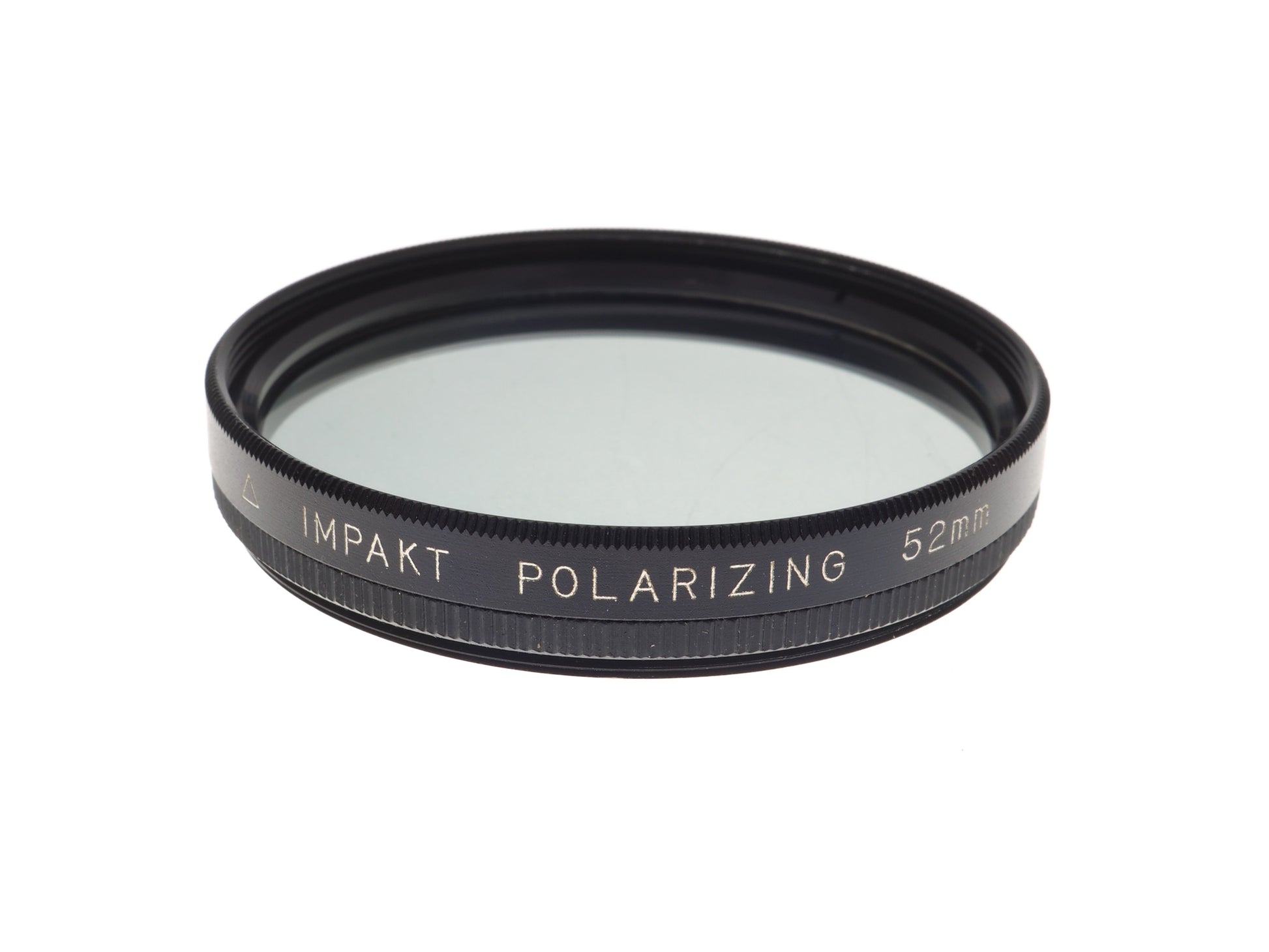 Circular polarizing filter from Impakt for lenses with 52mm filter threads. Reduces glare and reflected light at any angle due to rotating design. Black metal construction with knurled sides and edges.