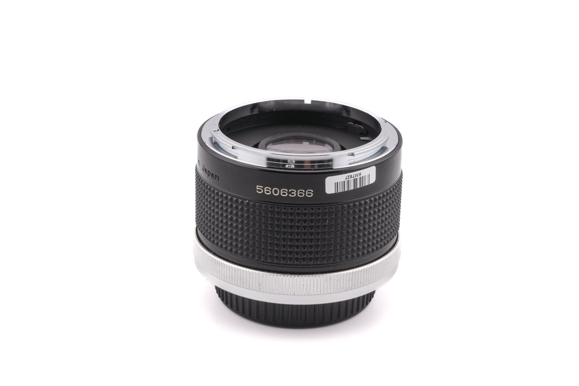 2x teleconverter made for FD-mount cameras and lenses introduced by Kenko. It multiplies the focal length by two and reduces the light transmission by two stops. Metal body available in black with chrome accents.