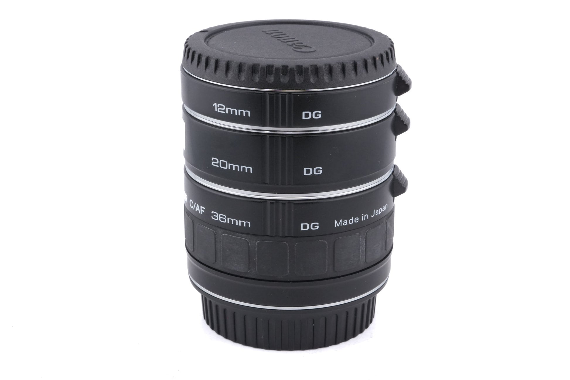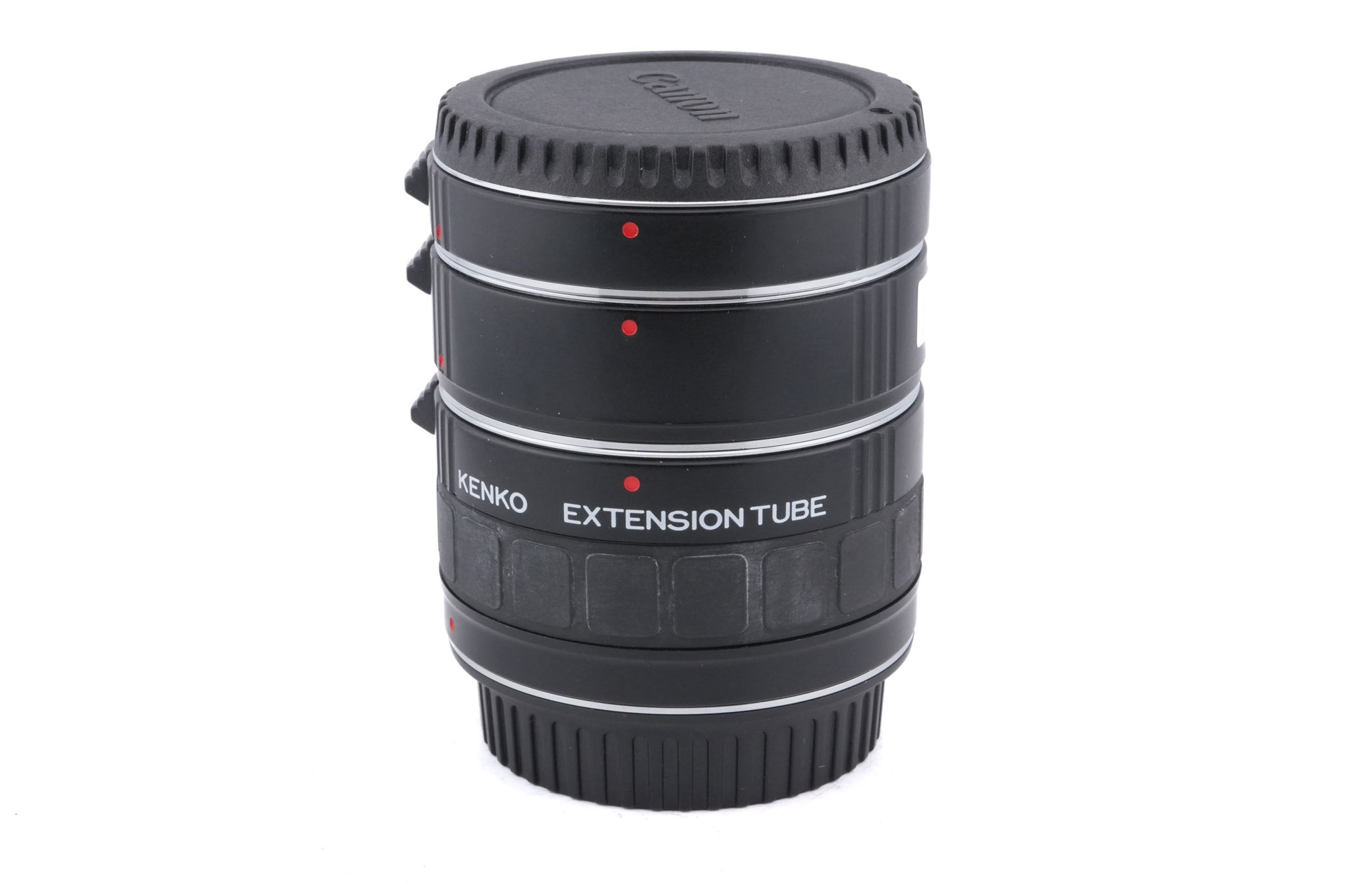 Extension tube set made for EF-mount SLR cameras and lenses by Kenko. It consists of a 12mm, 20mm, and 36mm tube. Plastic and metal body available in black.