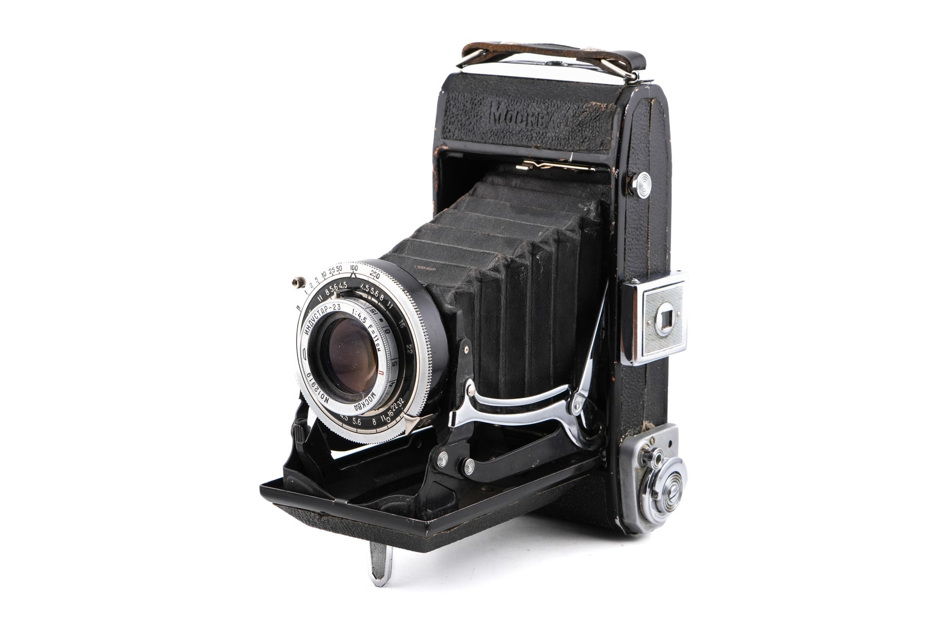120 medium format 6x9 manual focus folding camera made by Soviet factory KMZ introduced in 1947. The Moskva is based quite heavily on the Zeiss Super Ikontas. Metal body available in black.