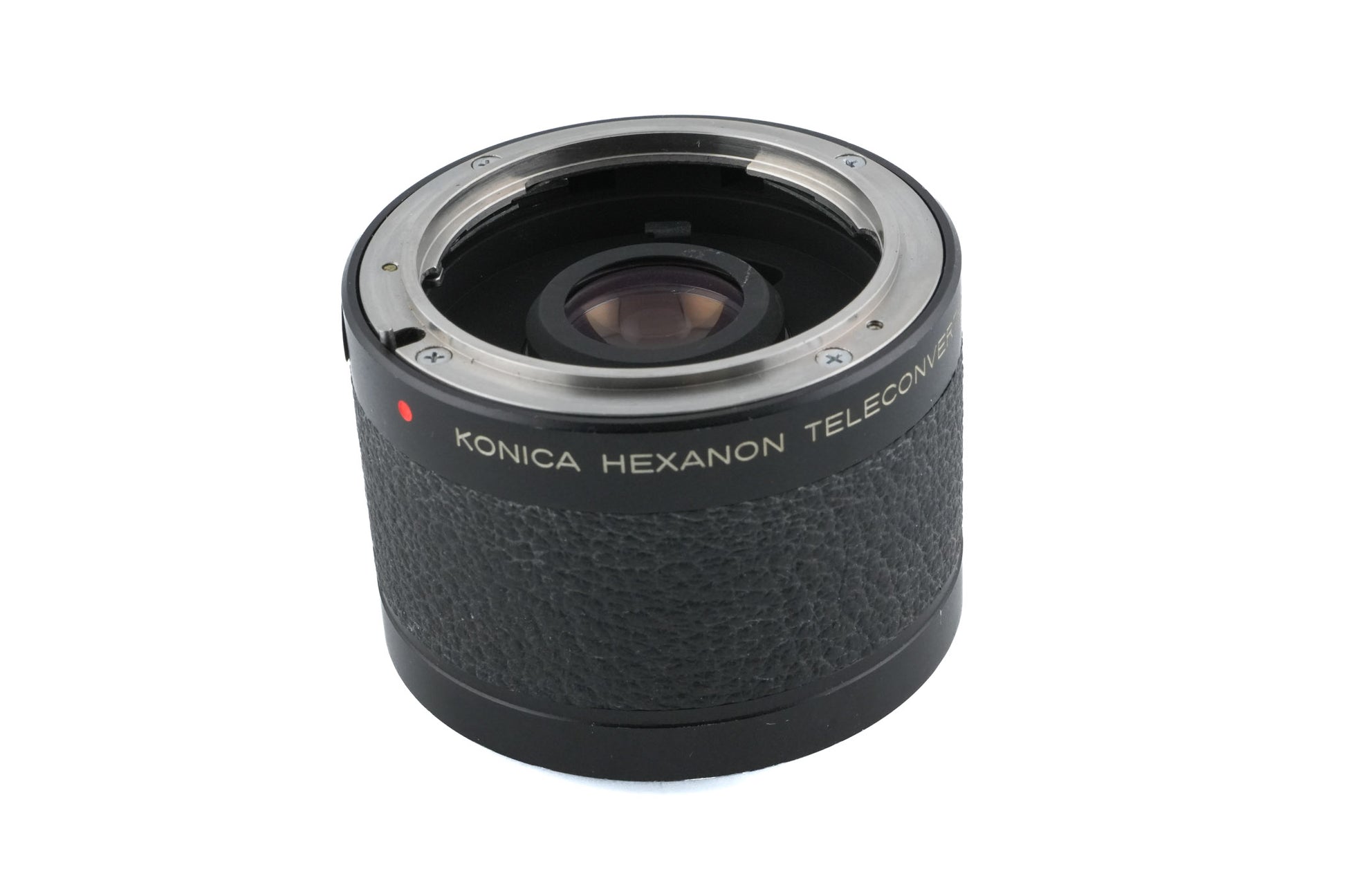 Doubling teleconverter for AR-mount SLR cameras made by Konica. Reduces light passing through by two stops. Aperture information passes through. The back plate rotates freely. Metal body in black finish.