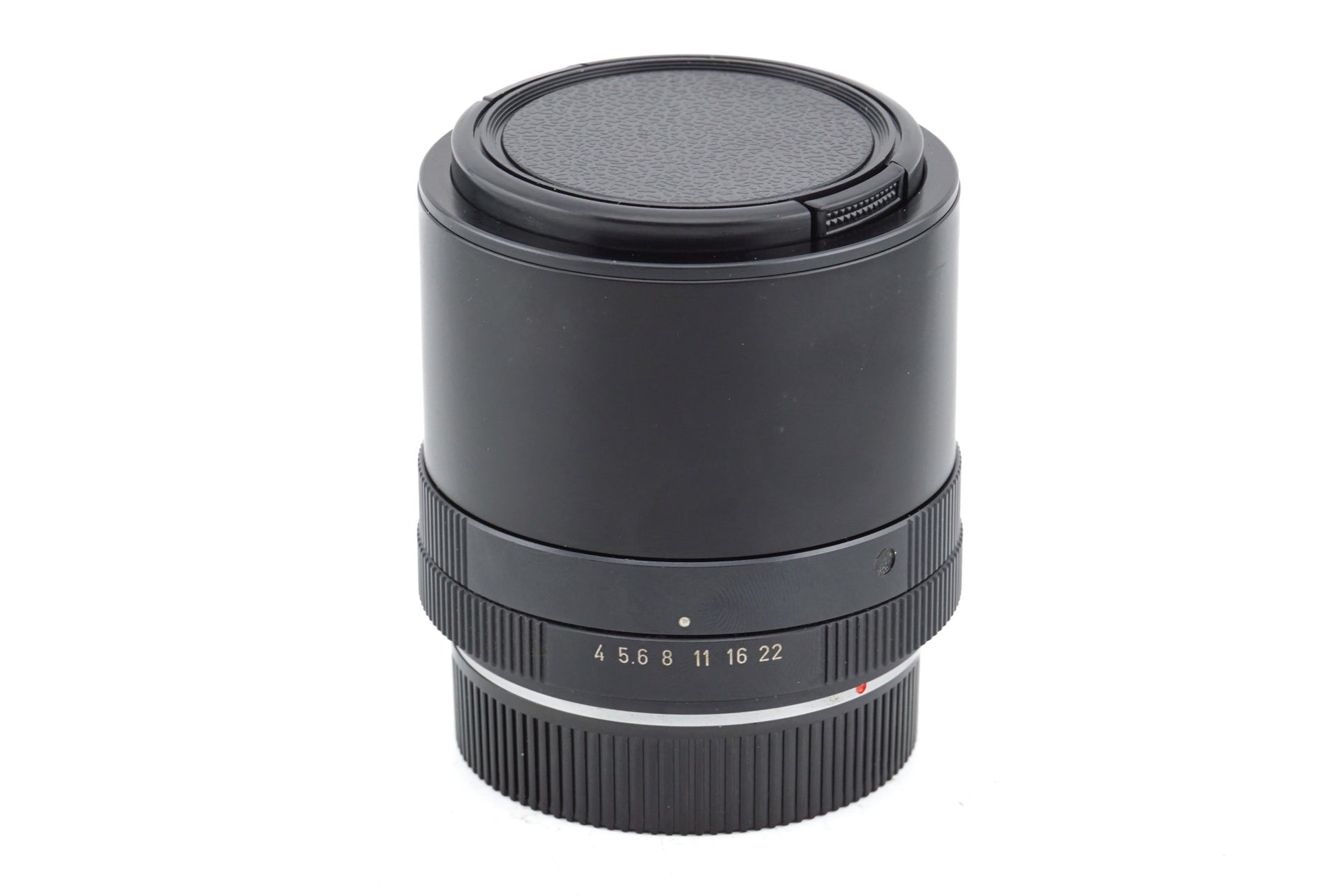 Short telephoto macro prime lens made for the R-mount macro bellows by Leica. The lens itself has only aperture control with no focusing helicoid, meant to be used with bellows 16860. Metal construction in black finish.