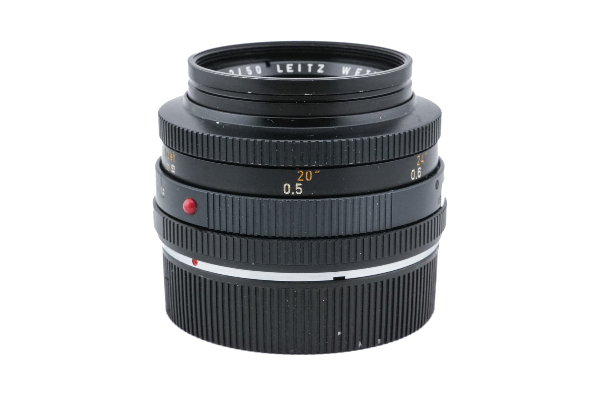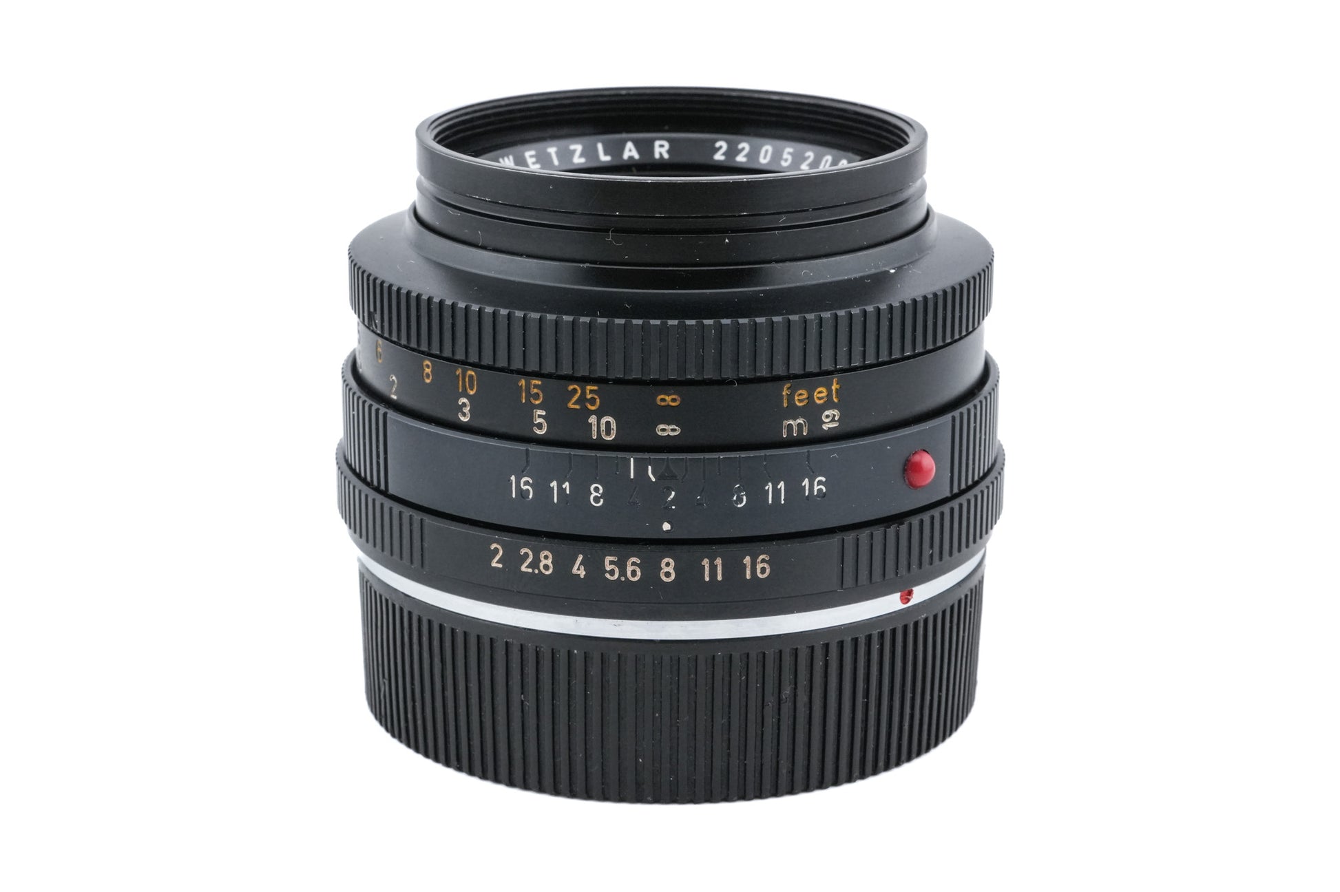 Manual focus normal lens made for R-mount 35mm SLR cameras introduced by Leica in 1964. It was initially released in silver, but this was quickly changed to black. Only 200-300 silver lenses were ever manufactured. This lens has a 2-Cam mount. 2-Cam lenses have two sloped cams and are compatible with the standard Leicaflex and R-series cameras in stop-down metering mode only. They are not recommended to be used on the R8/R9. Metal body available in black (11228).
