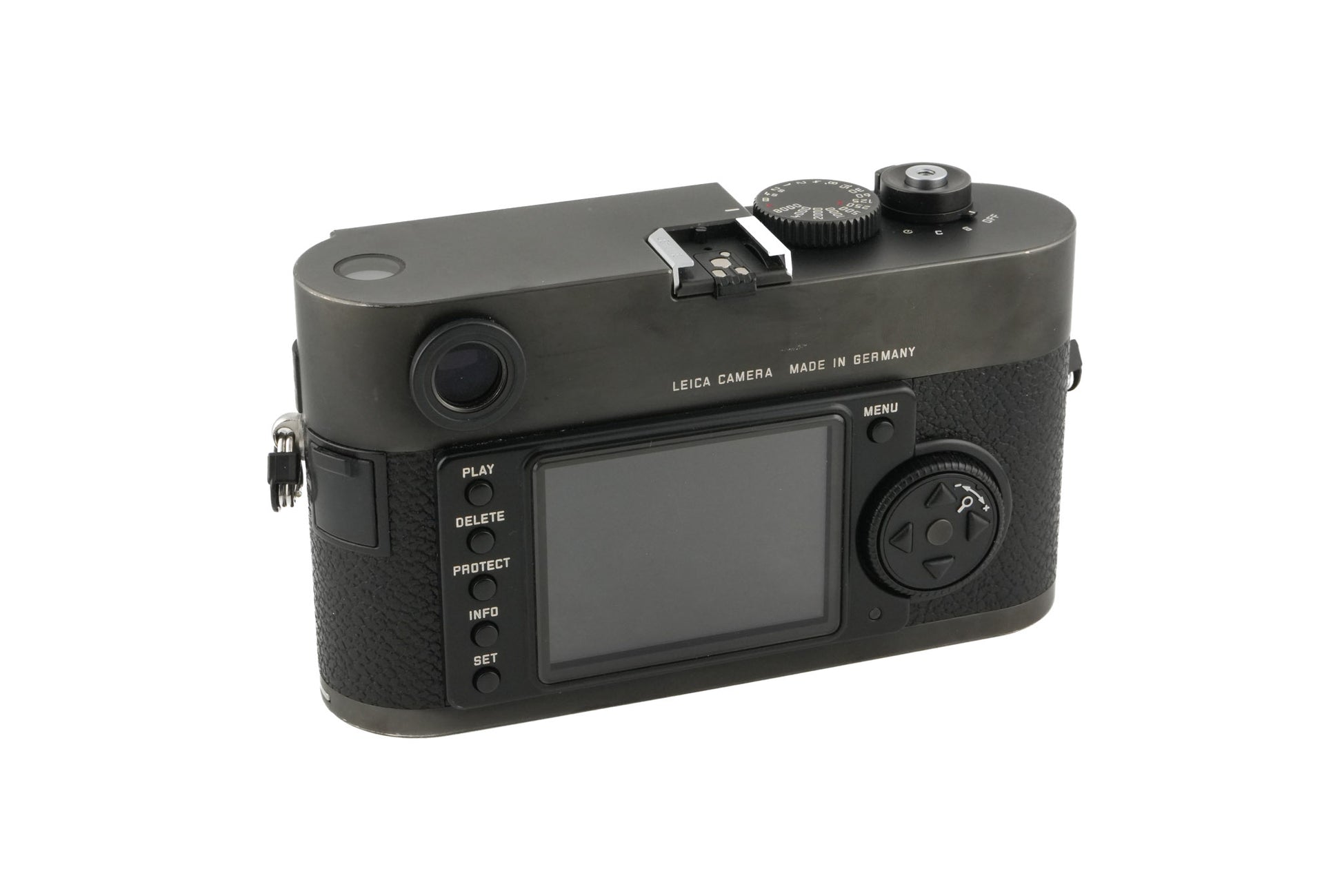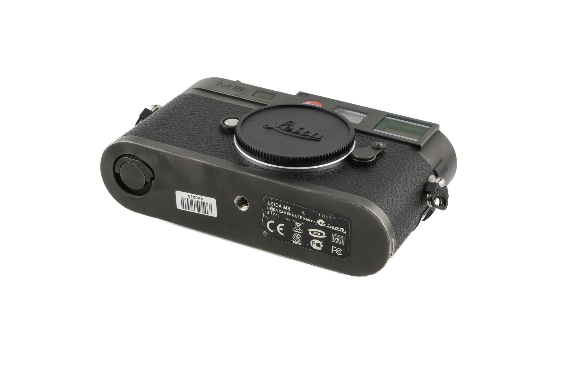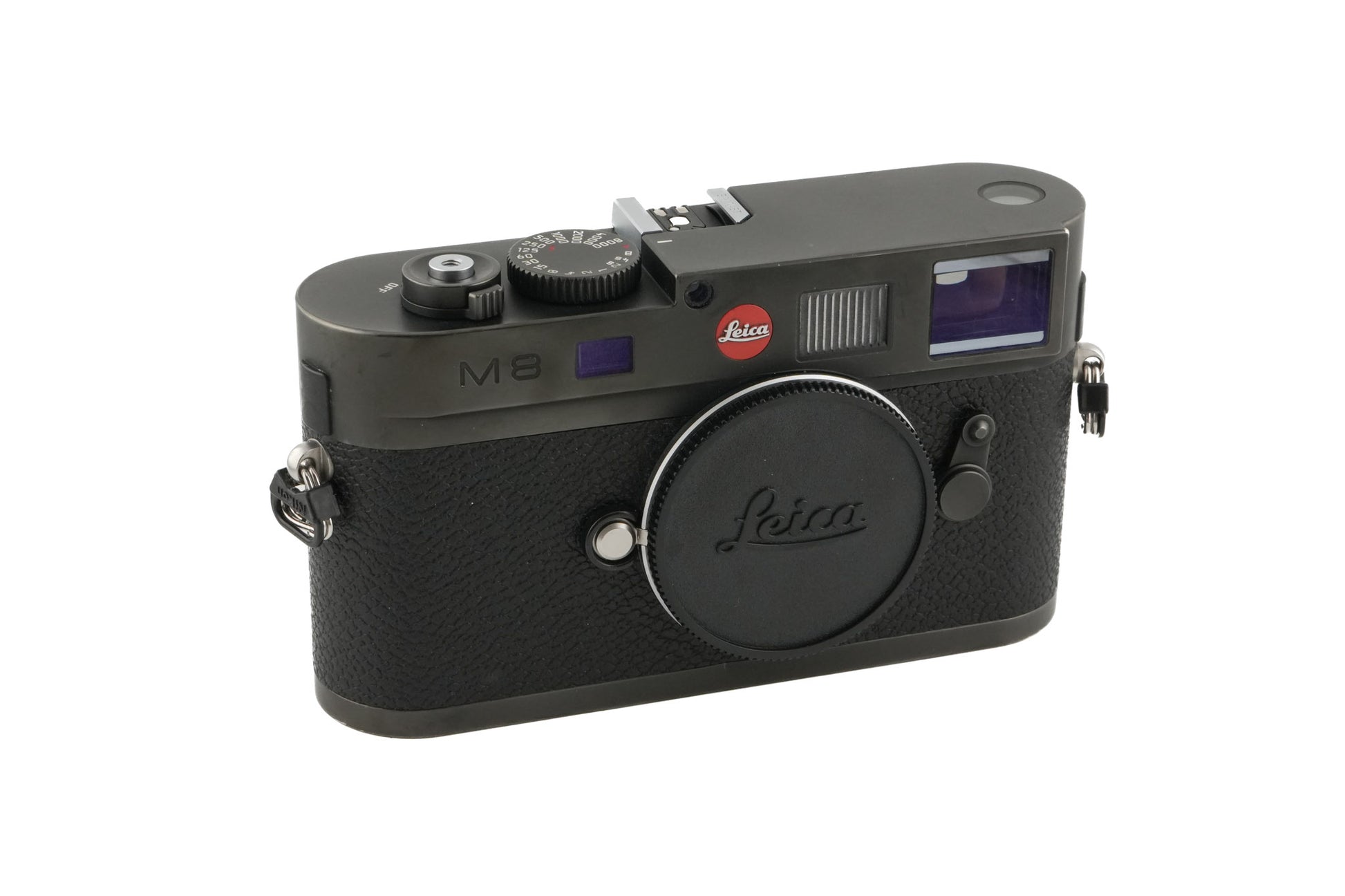 Manual focus APS-H M-mount digital rangefinder camera introduced by Leica in 2006. The M8 was the first digital M-mount camera produced by Leica. It has a 27x18mm sensor with a 1.33x crop and lacks a built-in IR/UV filter. It has a 2.5” rear LCD and uses SD cards for storage. The viewfinder has a magnification of 0.68x and framelines for 24/35mm, 28/90mm, and 50/75mm. Metal body available in black (10701).
