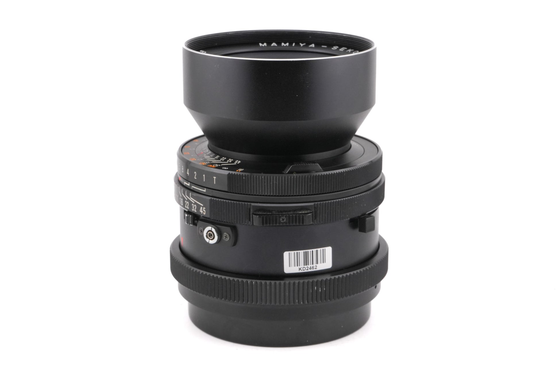 Manual focus telephoto lens made for RB67 120 SLR cameras by Mamiya starting in 1974. It gives the equivalent field of view to a 90mm lens on 35mm full frame. Metal body available in black.