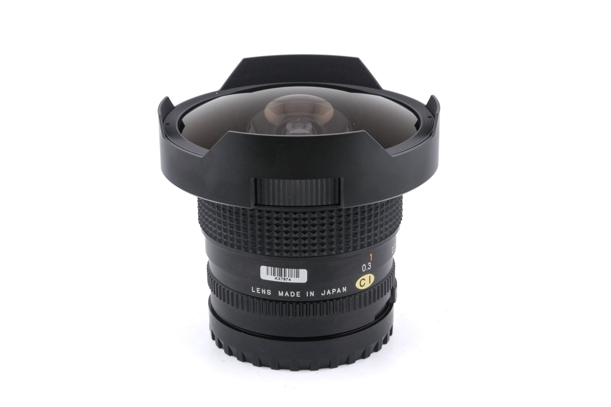 Manual focus fisheye lens made for 645 mount 120 SLRs by Mamiya. It gives the equivalent field of view to a 15mm lens on full frame/35mm. It has built-in UV, skylight, warming, and cooling filters. Metal body available in black.