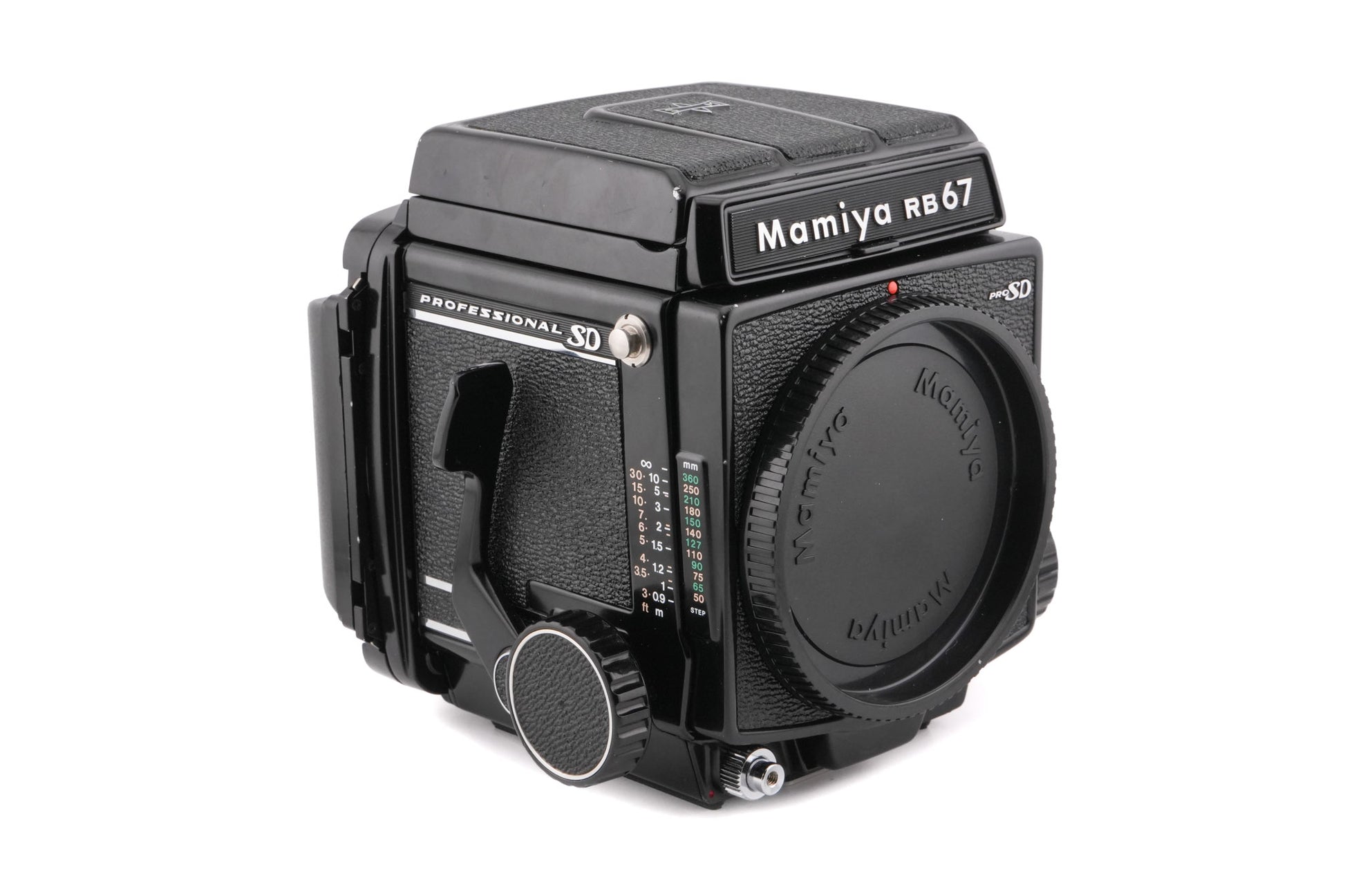 Manual focus RB67 mount 120 SLR camera released by Mamiya in 1990. The Pro-SD was the final version of the Mamiya RB67 line of modular SLRs. It is a fully mechanical system with interchangeable film backs, prisms, focusing screens, grips, and leaf-shutter lenses. The film back can rotate (RB = Rotating Back) to allow for landscape or portrait photography. Plastic/metal body available in black.