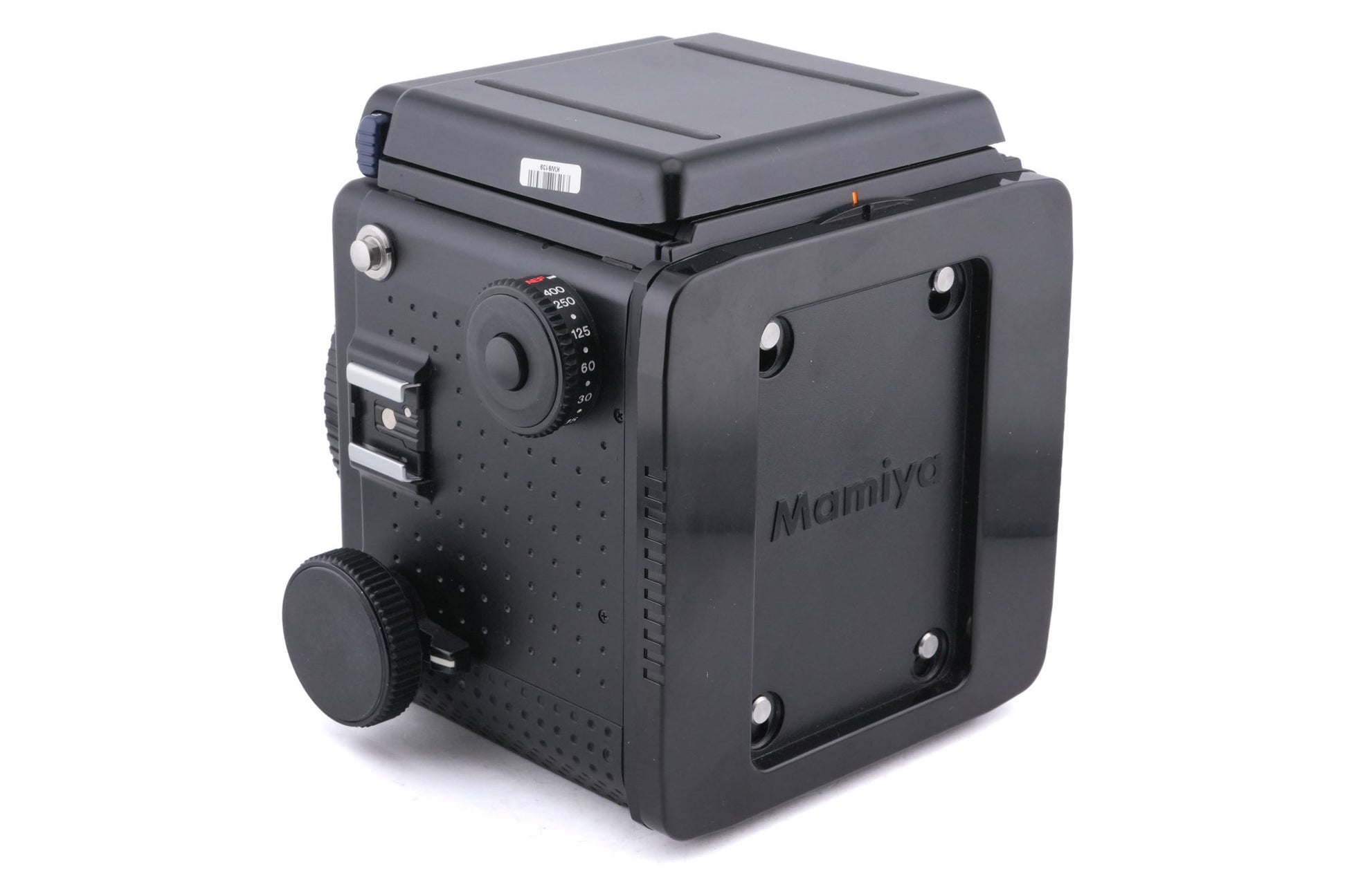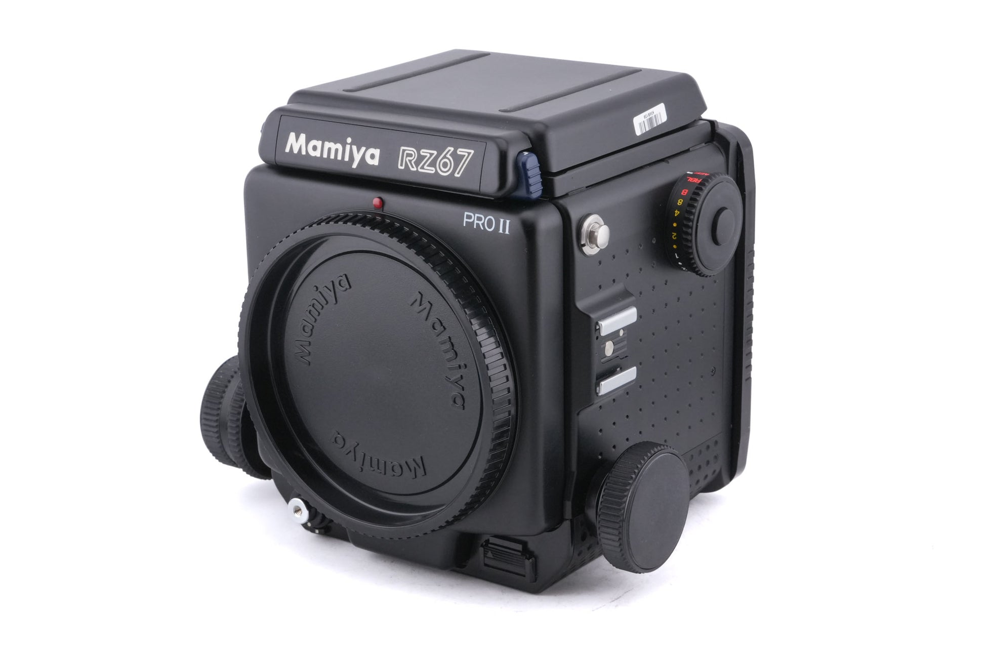Manual focus RZ67 mount 6x7 120 SLR camera released by Mamiya. Improvements over the original Pro include electronic upgrades, 0.5EV shutter increments, and a fine focusing knob. Metal and plastic body available in black.