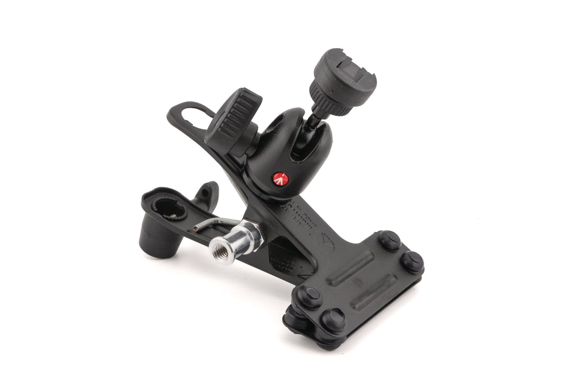 Spring clamp with a flash shoe made by Manfrotto. Metal and plastic body available in black.