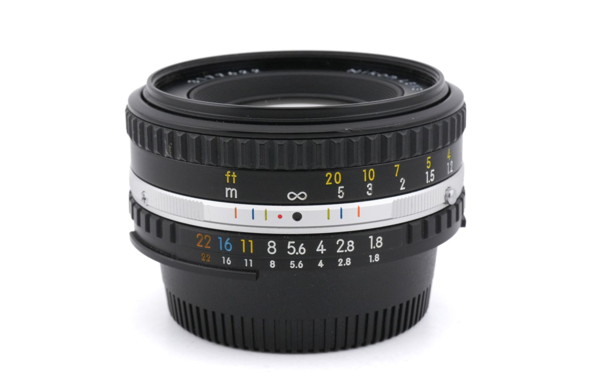 Manual focus normal lens made for F-mount 35mm SLRs by Nikon. It does not have the bunny ear metering prongs but does have the AI ridge and AI-S indent, so it will meter properly on nearly all manual focus Nikon cameras (excluding F, F2, and Nikkormat) and will work with the advanced program modes of later models. Early versions are all black, and later versions have a chrome ring. Metal and plastic body available in black.
