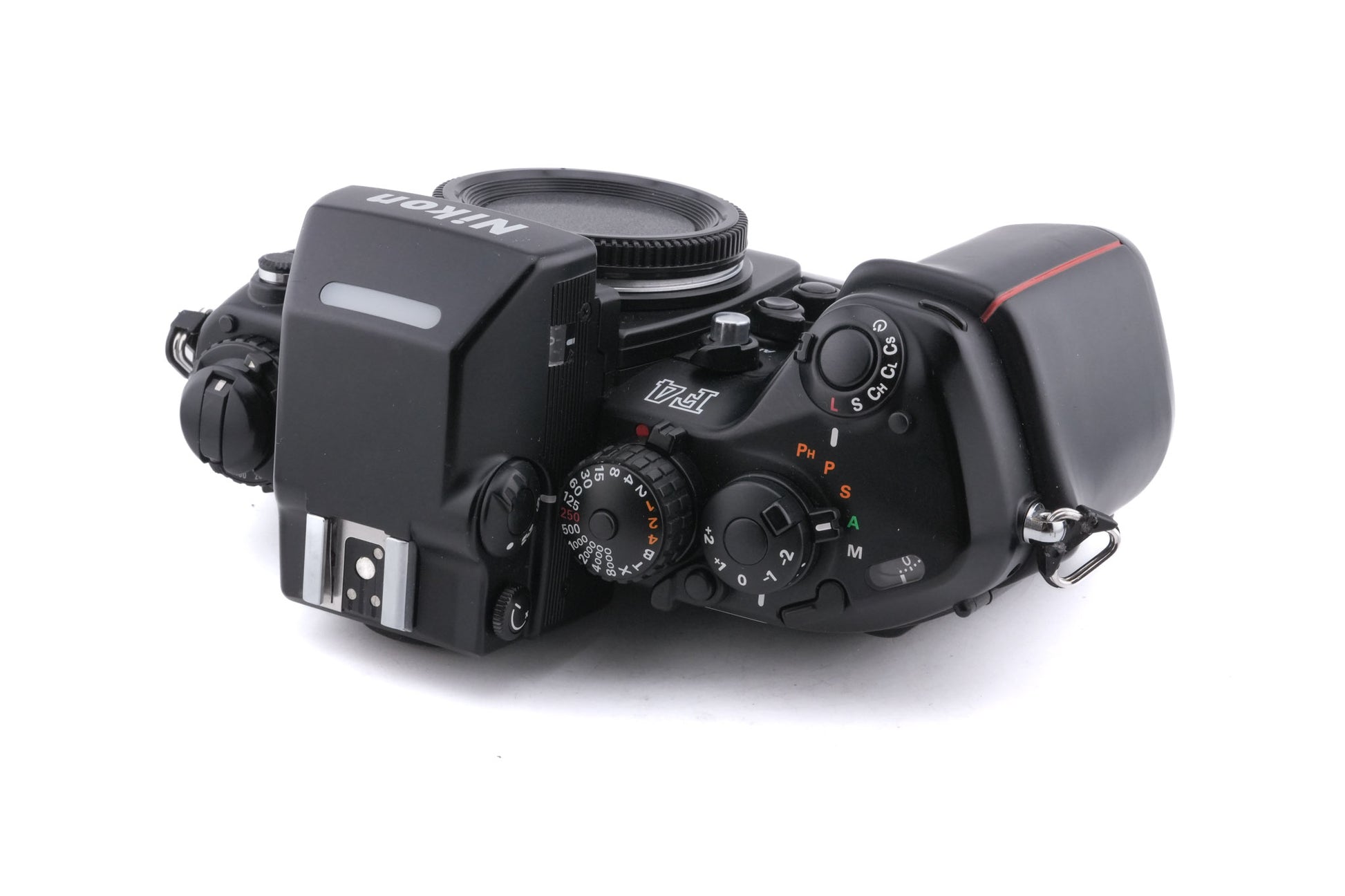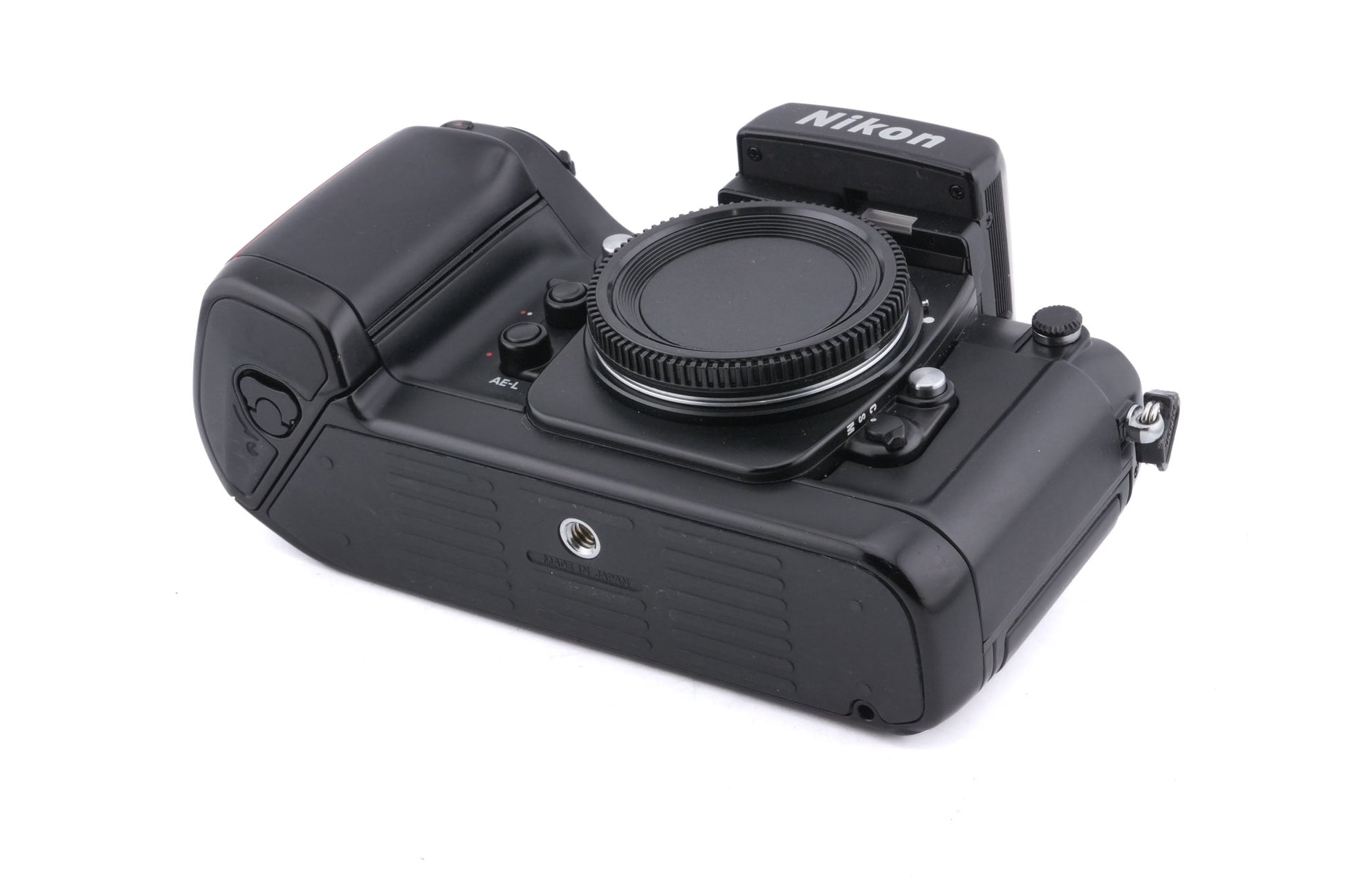 Autofocus F-mount 35mm SLR released by Nikon in 1988. This is the base F4 with the MB-20 battery grip. The body has matrix metering, weather sealing, interchangeable grips, finders, and focusing screens. It will work natively with AI and AI-S lenses (including matrix metering!) as well as autofocus lenses with aperture rings. Later autofocus lenses without aperture rings can only be used in program and shutter priority modes and without image stabilization (VR). Metal and plastic body available in black with a red accent.