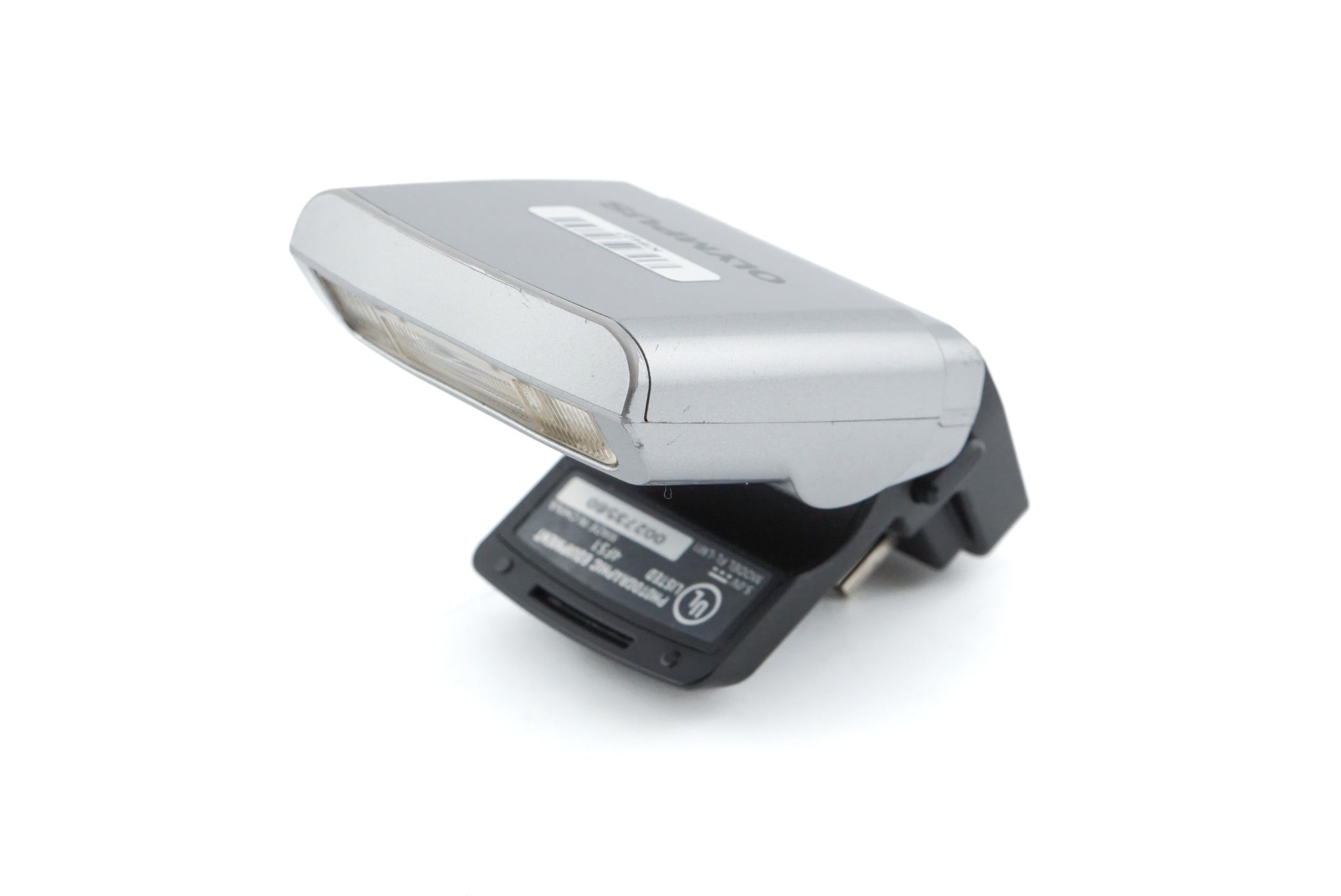 Small-sized flash unit made by Olympus. Plastic body available in silver.