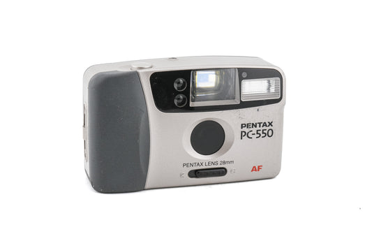 Autofocus 35mm compact camera from Pentax. The camera's features include motorized film advance and rewind and an integrated flash. Plastic body in silver finish.