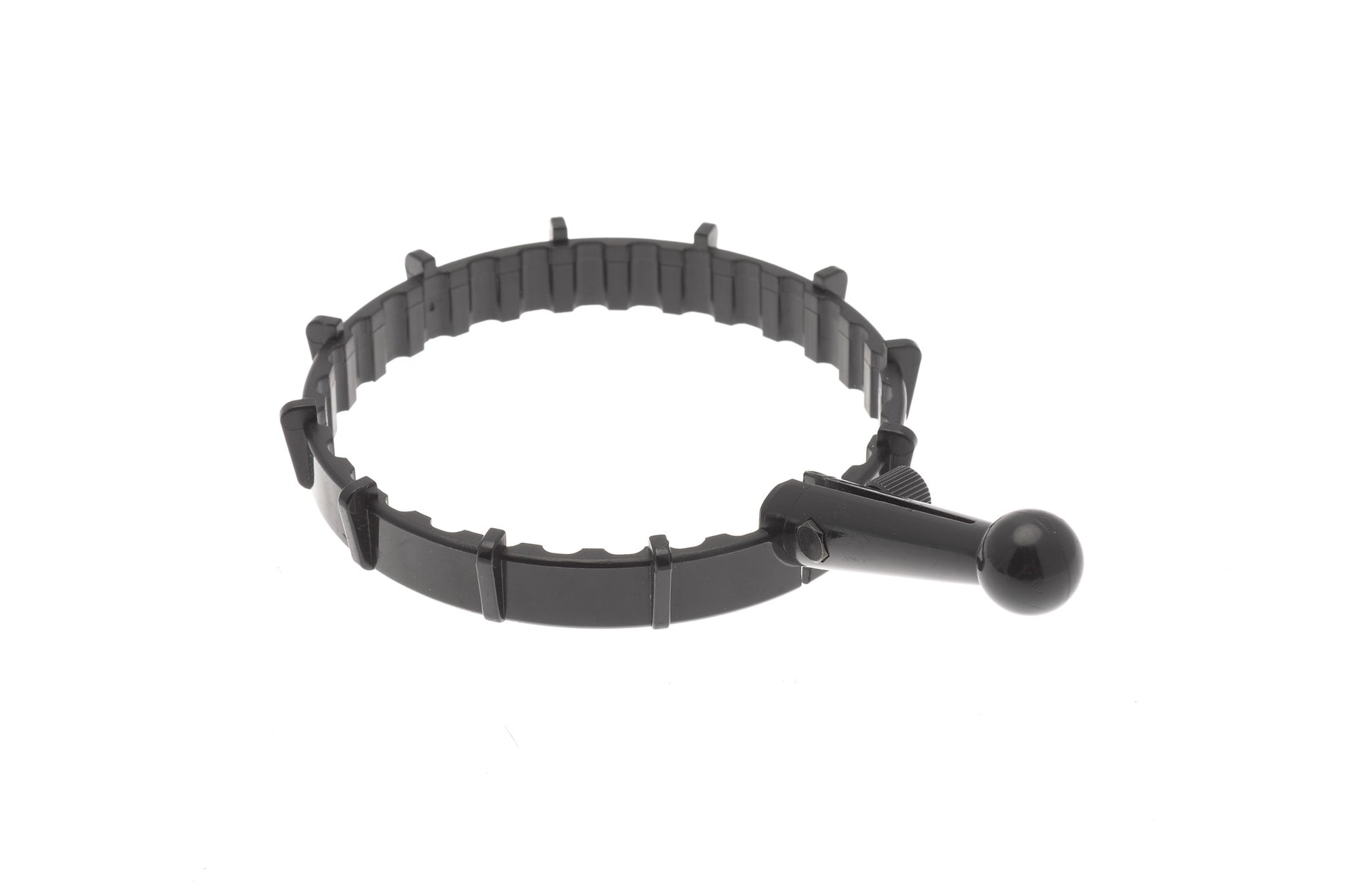 Clamp on design with a tightening screw. Teeth inside the ring, roughly 80mm internal diameter. Black plastic body.