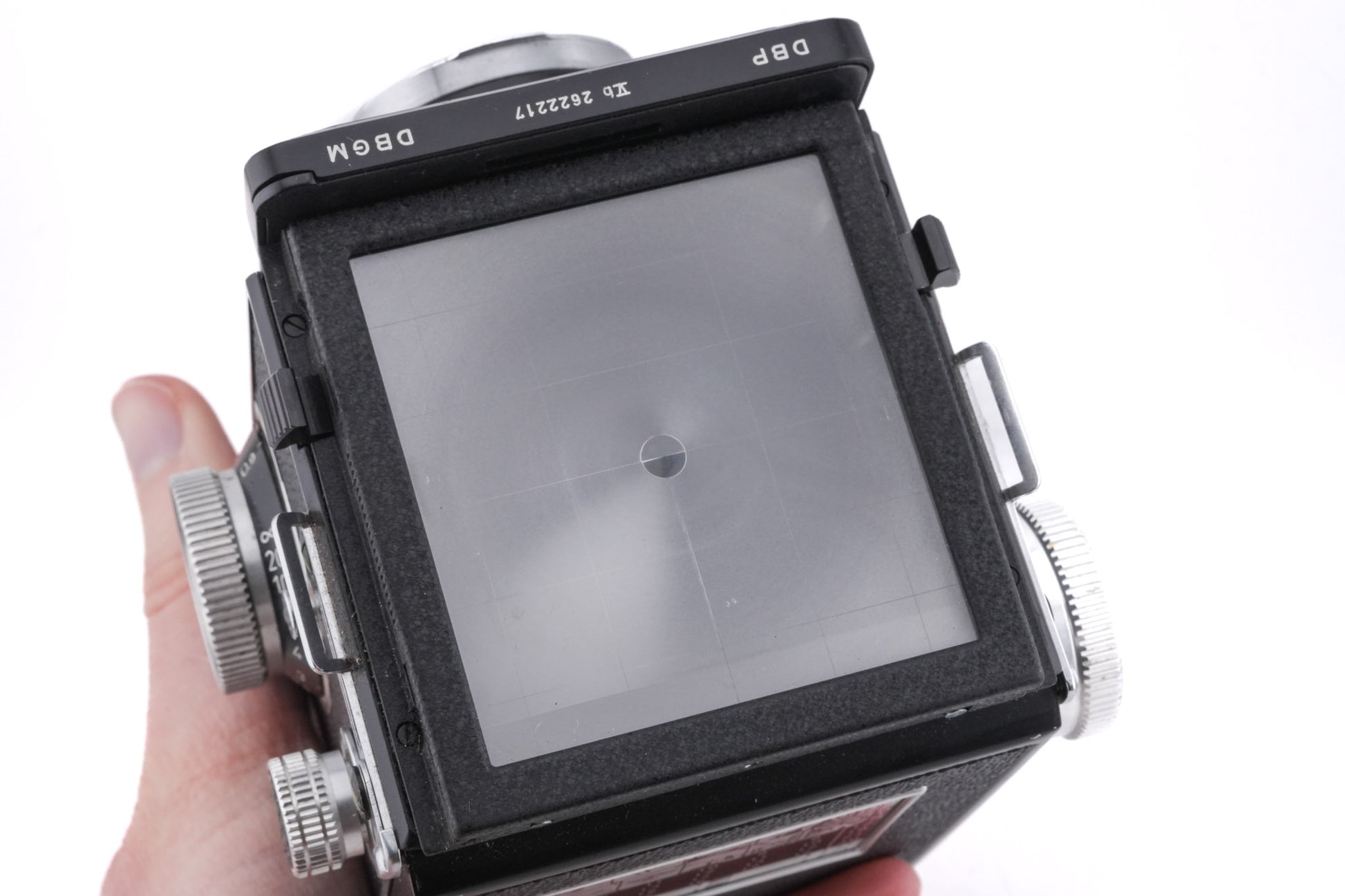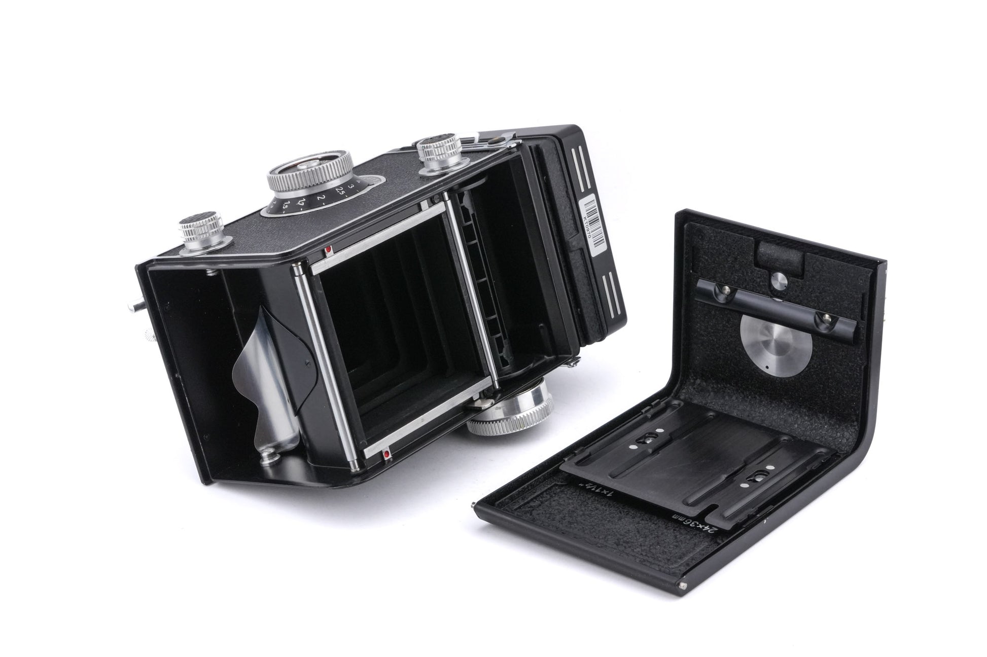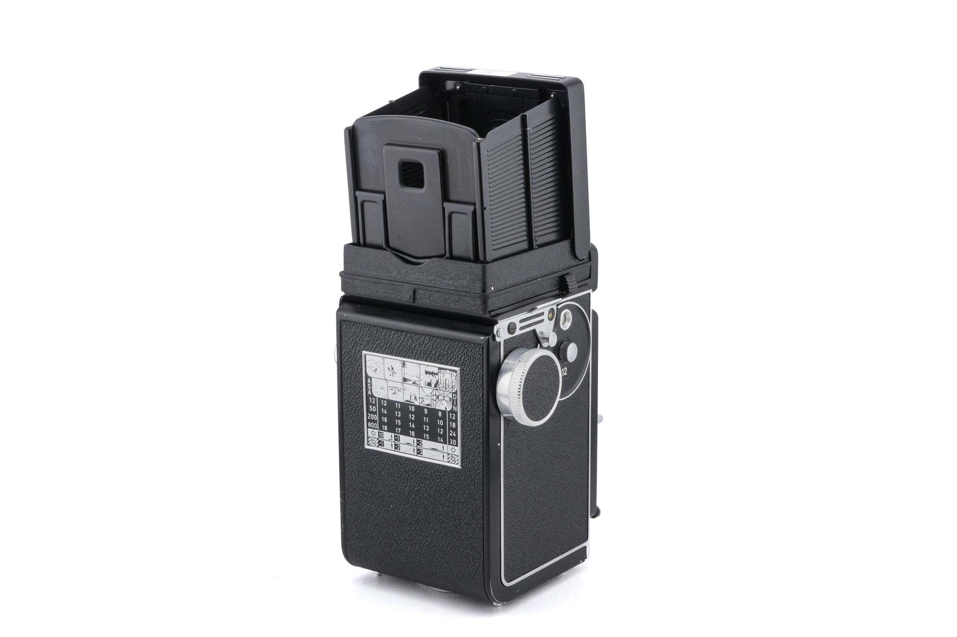 Manual focus 120 TLR released by Franke & Heidecke in 1962. The lens gives the equivalent field of view to a 41mm lens on full frame/35mm. About 44,500 were made, all with the same combination of shutter and lens. The camera uses an EV scale and locked shutter speed/aperture combinations. This is the first model of 3.5F and is identifiable by its MXV-type shutter. Metal body available in black & silver.