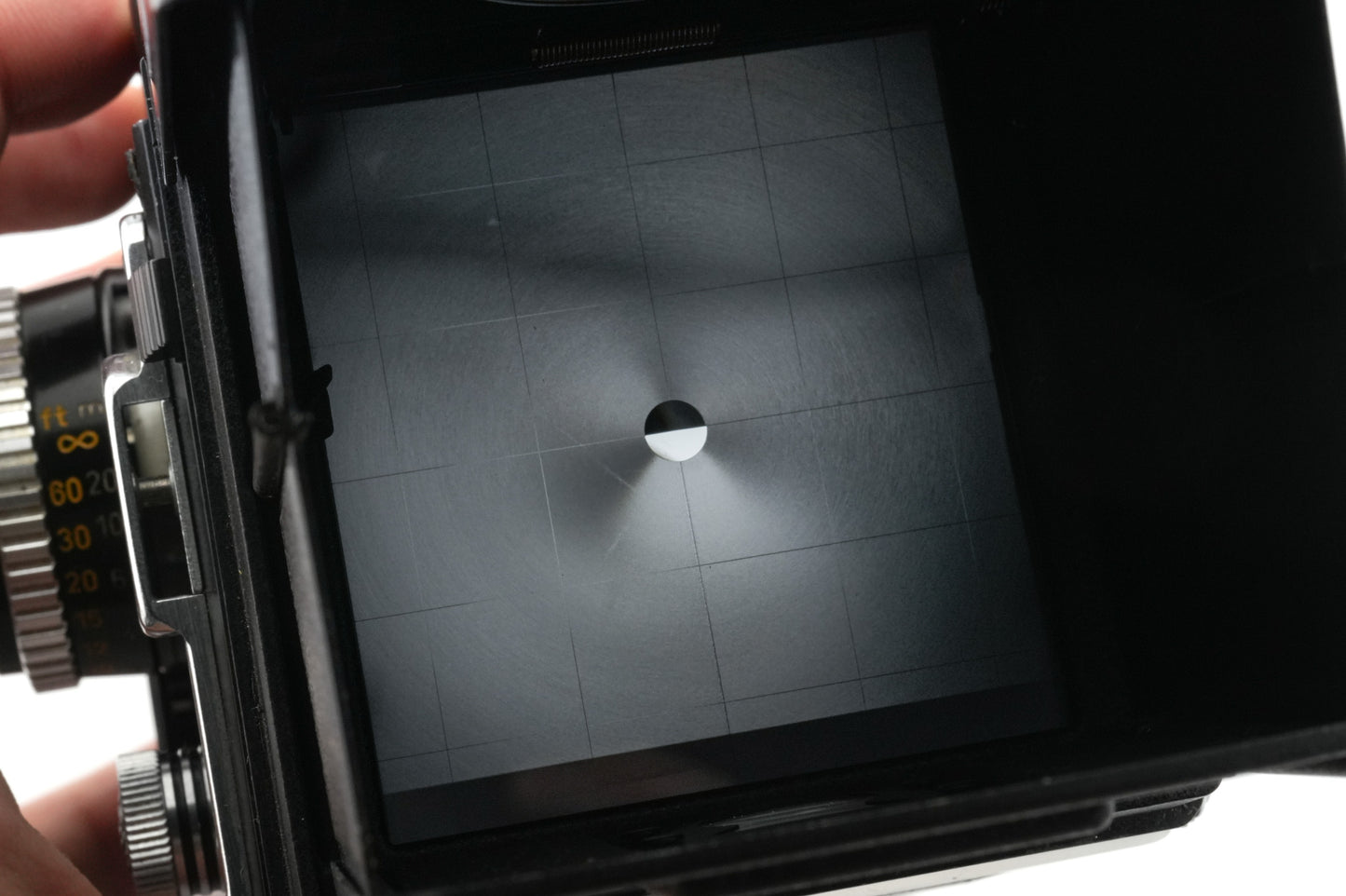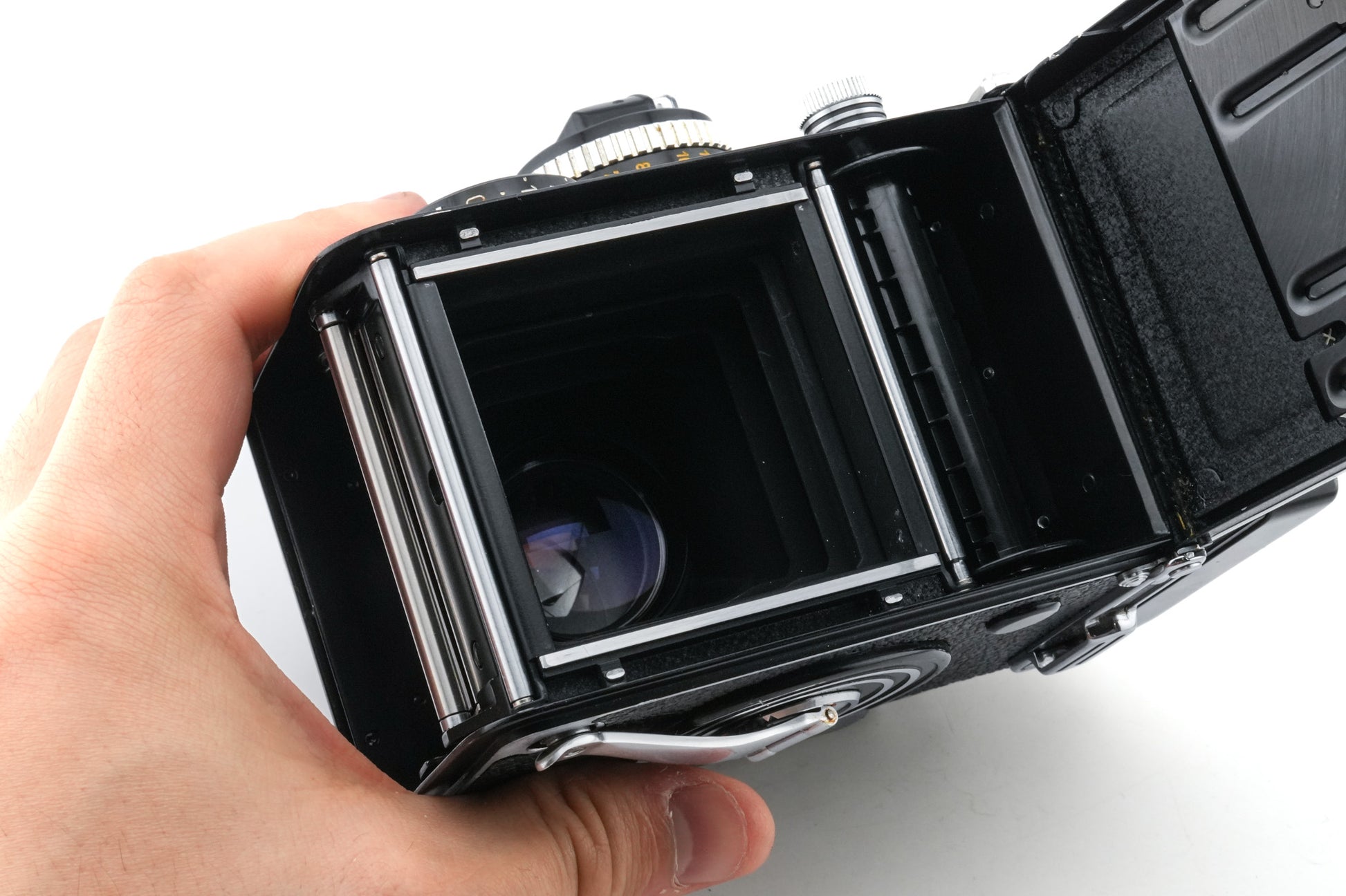 Normally, the viewing lens redirects light upwards towards a waist level viewfinder and the lower lens exposes the film using a built-in leaf shutter. Because of the way this system works the image in the viewfinder is flipped horizontally, which can take some time to get used to. There are also slight differences in framing between the two lenses that can affect images at close focusing distances.