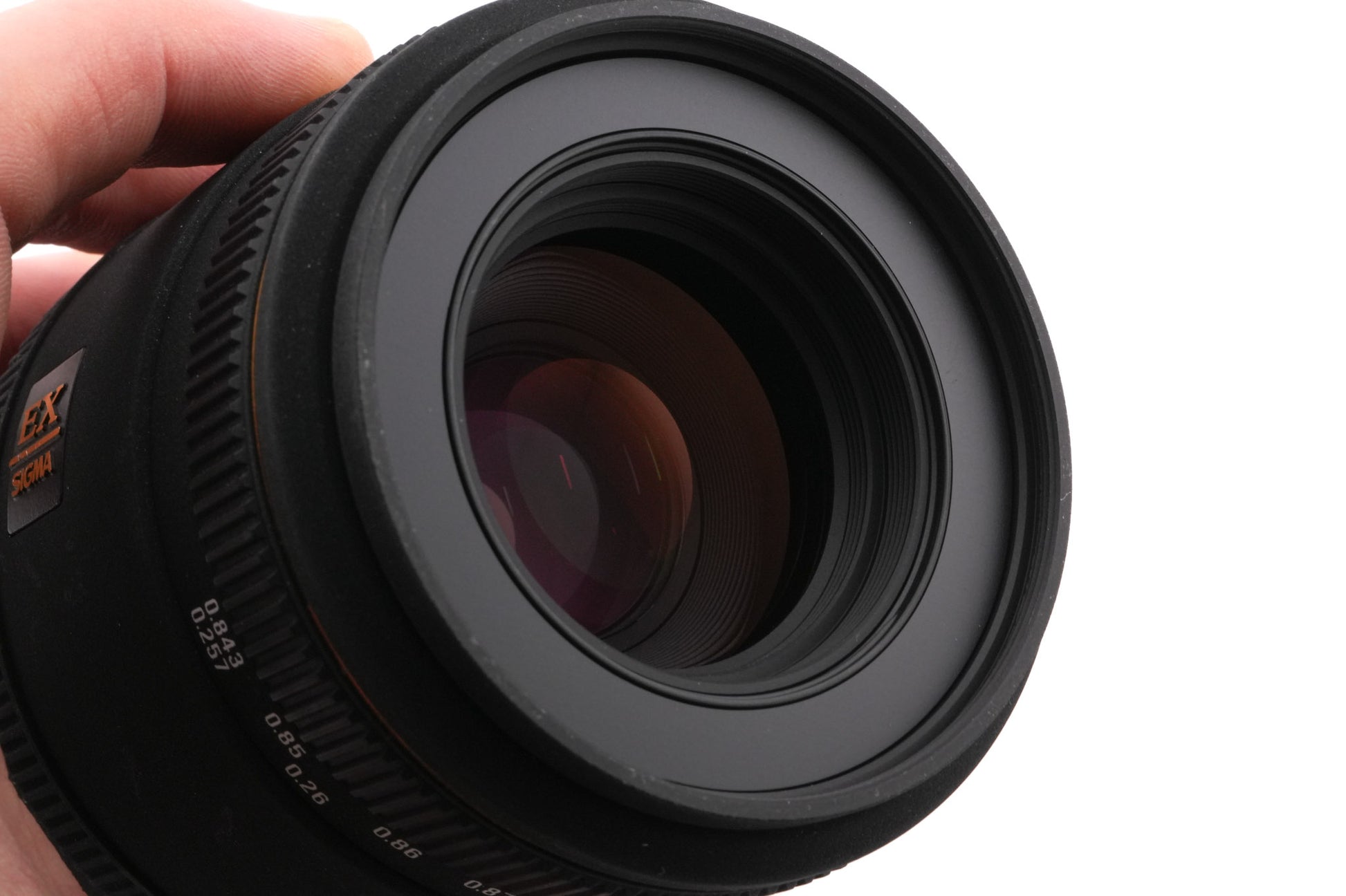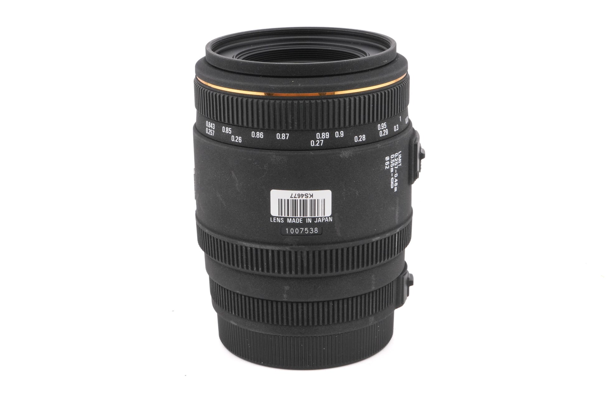 Autofocus short telephoto macro lens made for Canon EF mount cameras by Sigma. Has a 1:1 reproduction. Metal and plastic body available in black.