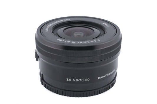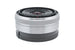 Autofocus wide-angle lens made for E-mount mirrorless digital cameras by Sony. The product code is SEL16F28. Plastic body available in silver.