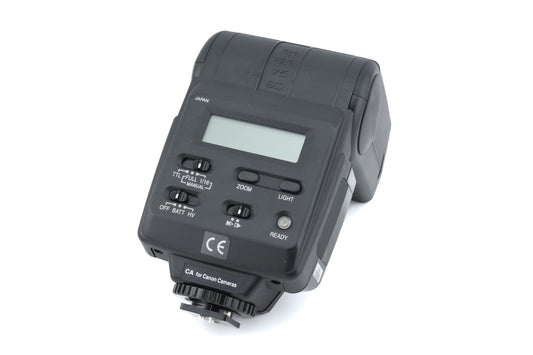 Flash made by Sunpak for Nikon F cameras. Has a motor-driven zoom head that automatically adjusts to match the focal lengths of lenses being used (28mm, 35mm, 50mm, 80mm). The head tilts upward 90° for bounce lighting. Plastic body available in black.