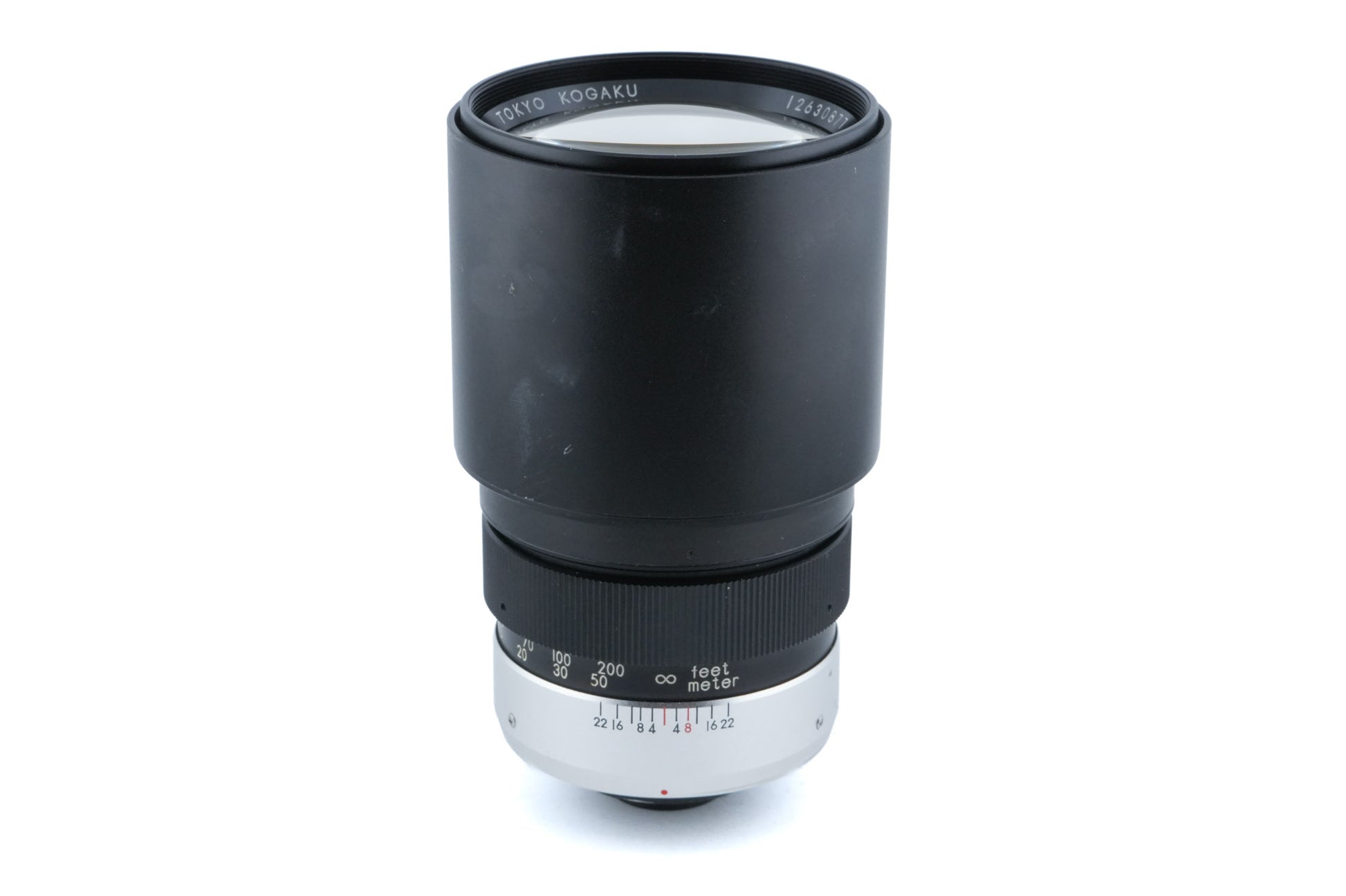 Manual focus telephoto lens made for UV-mount SLR cameras made by Topcon. It has a silver base with distance scale and a large built-in hood that slides up over the front of the lens. Metal body available in black.