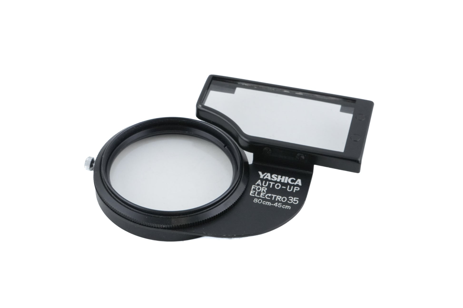 Close-up lens attachment with correction lens for Yashica Electro 35 cameras. Reduces the minimum focus distance of the camera to 45cm. Metal body available in black.