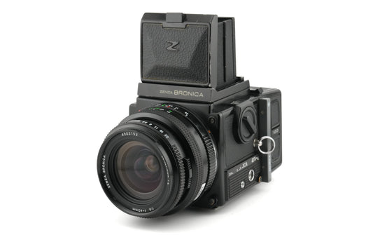 Manual focus 6x4.5 medium format SLR camera made by Zenza Bronica. Metal body available in black.