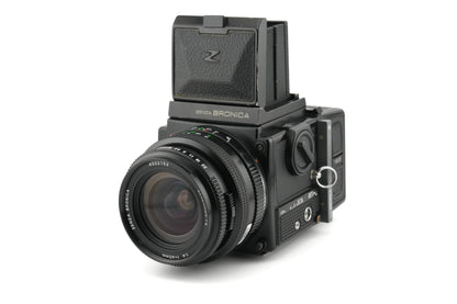 Manual focus modular SLR made by Zenza Bronica. It takes 6x4.5cm images on rolls of 120 or 220. The camera features flash sync at all speeds, double exposure, and mirror lock-up. The lenses have leaf shutters, but the speeds are controlled by the body. Plastic and metal body available in black.