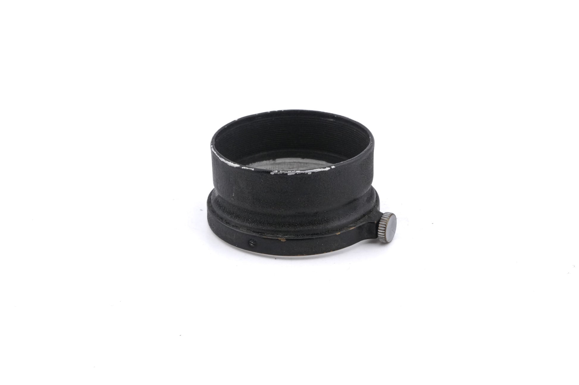 Lens hood made by Ernst Leitz Wetzlar for M39 rangefinder lenses. It is specifically designed to fit the 5cm f3.5 Elmar lens found on early thread-mount Leica cameras. It attaches via a tightening knob, so will fit around any lens with ~35mm external diameter. Metal body available in silver and black.