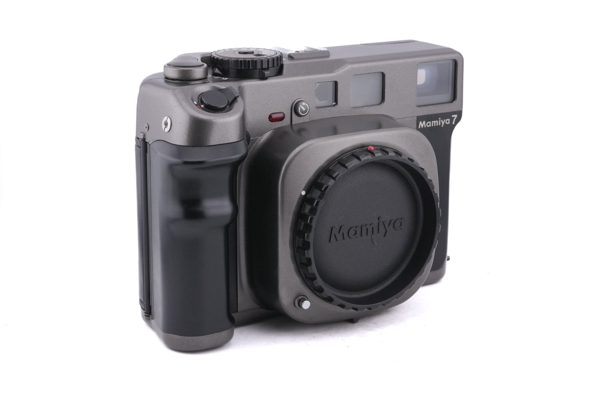 Manual focus 7 mount 120 rangefinder released by Mamiya in 1995. It is capable of shooting 10 6x7cm images per roll of 120 film. The viewfinder has framelines for 65mm, 80mm, and 150mm lenses. The internal light meter has a narrow field of view, somewhere between an average and a spot meter. The camera is capable of aperture-priority auto exposure and lenses can be changed mid-roll thanks to the built-in dark slide. Plastic body available in gray and champagne.