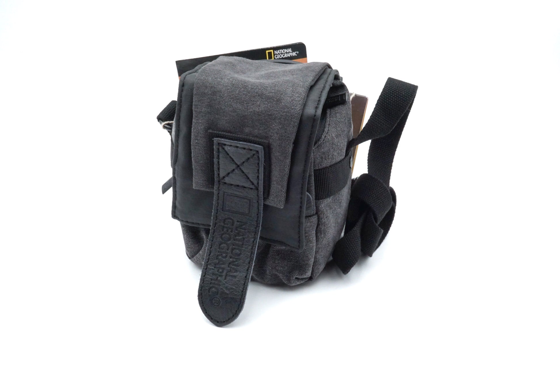 Camera bag for a small DSLR/SLR body and lens made by National Geographic. Canvas construction available in gray.