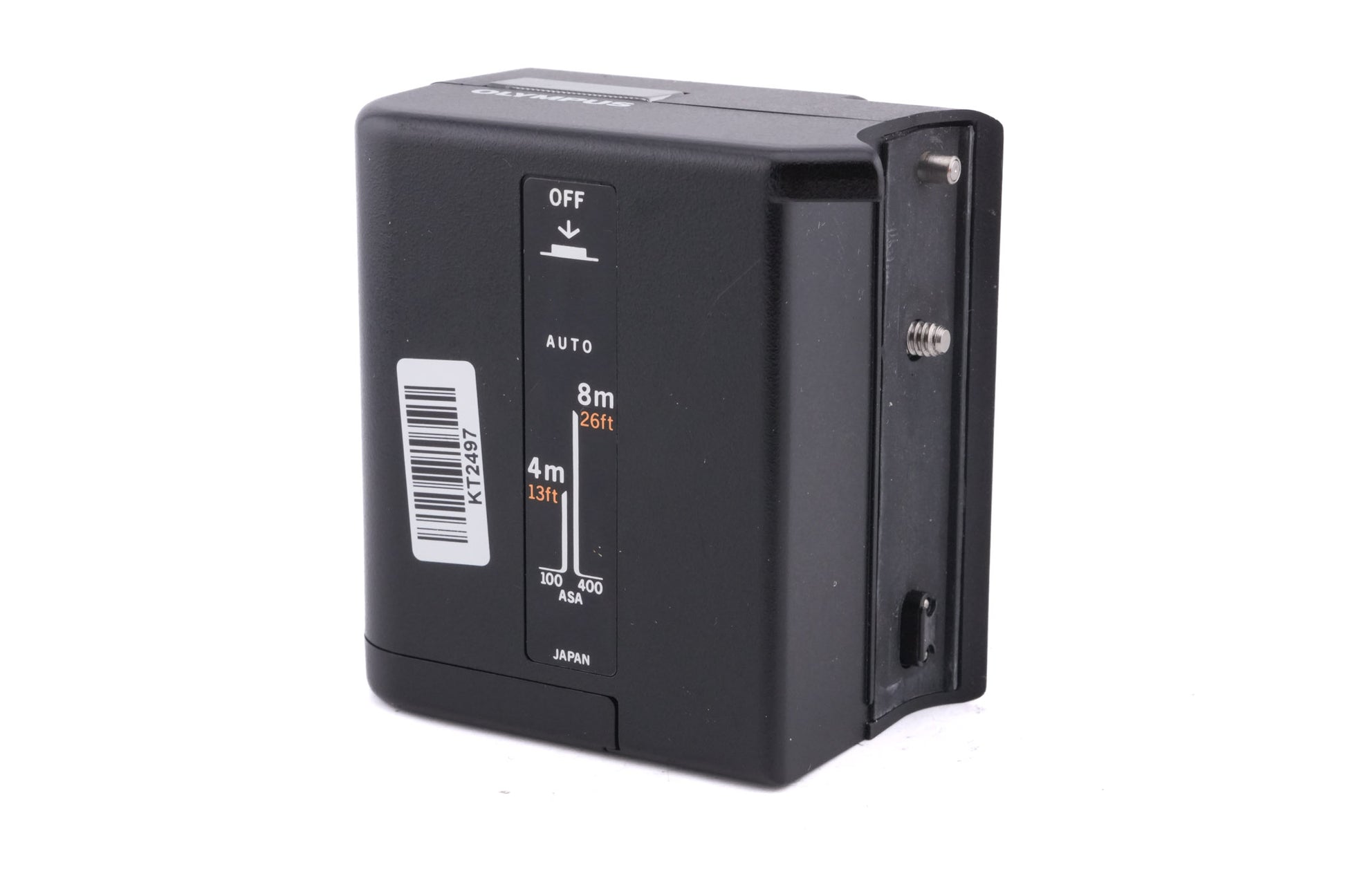 Electronic flash made for the Olympus XA series of cameras made by Olympus. A more powerful version of the more common A11 flash. It also uses two AA batteries instead of one. Plastic body available in black.
