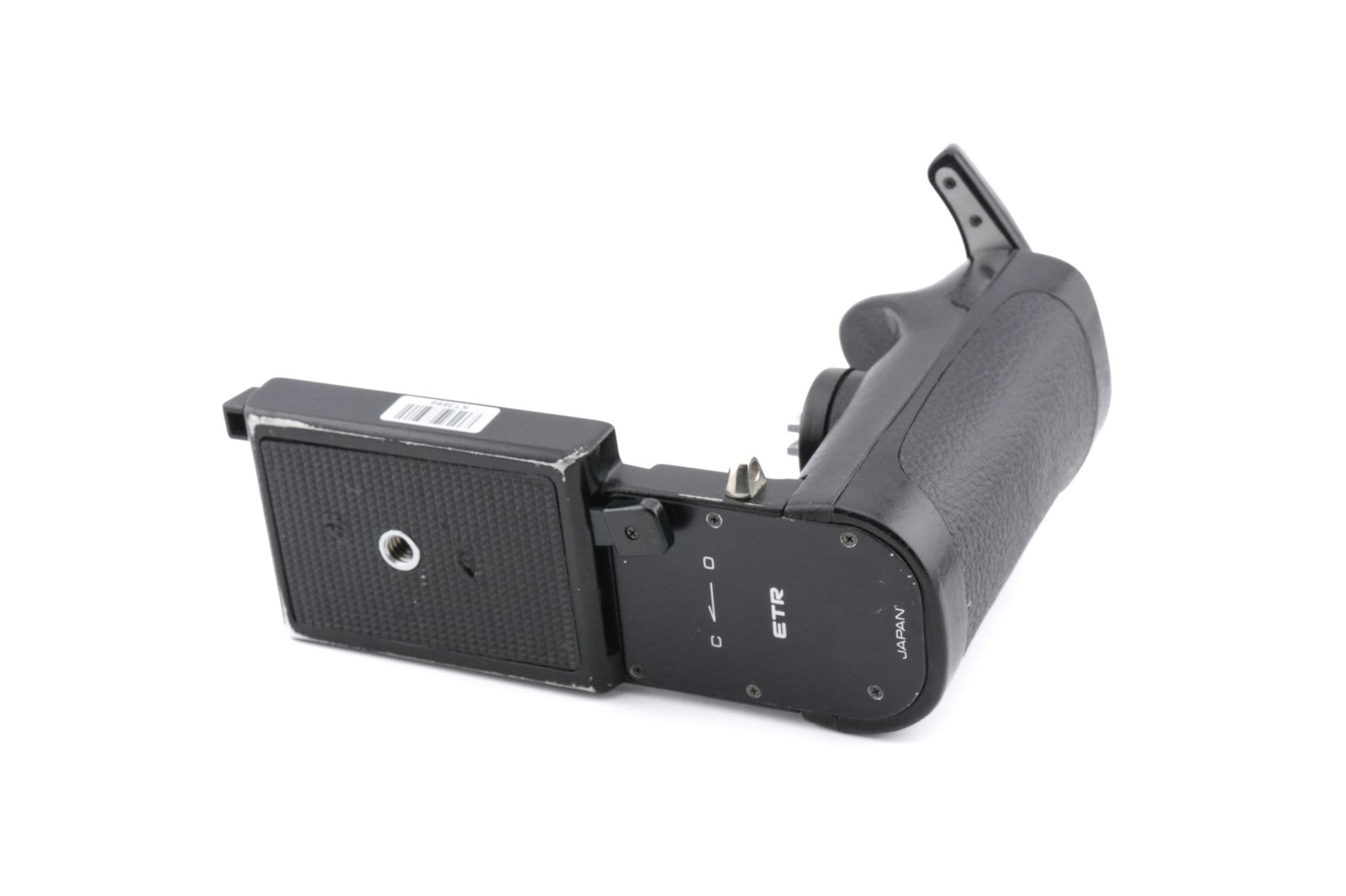 Speed grip for Zenza Bronica ETR 6x4.5 SLR cameras made by Zenza Bronica. Allows rapid film advance and easier grip with an eye-level finder. Built-in shutter release. Hot shoe for cordless flash use. Plastic and metal body available in black.