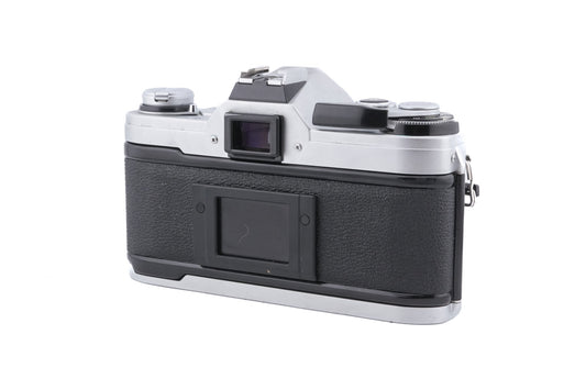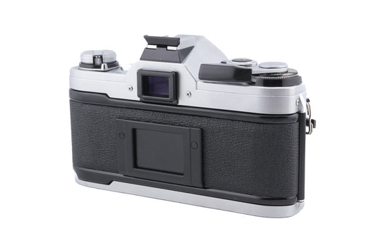 Manual focus FD-mount 35mm SLR released by Canon in 1977. This A-series body only has manual exposure and lacks the shutter-priority autoexposure found in the AE-1. The camera was manufactured purely for export. Metal body available in silver.