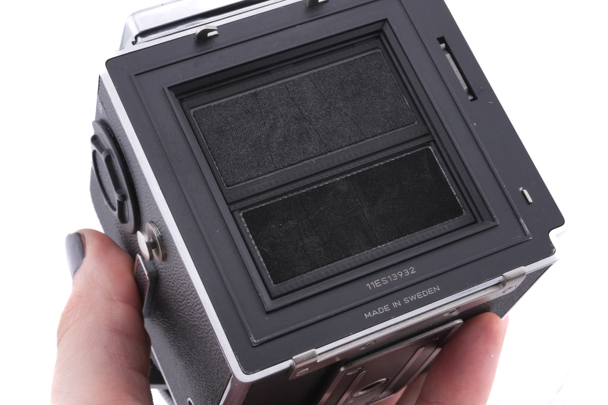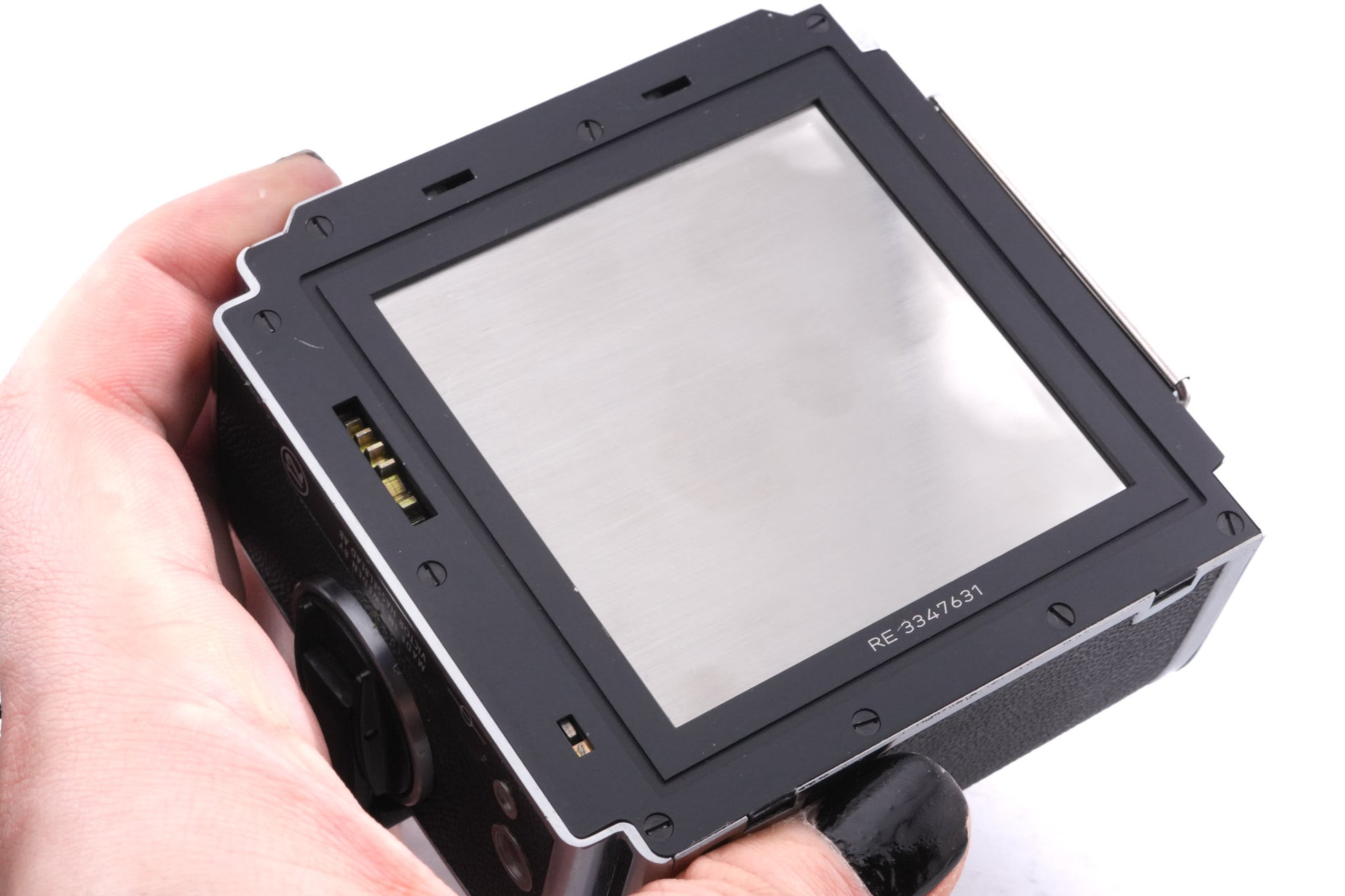 Manual focus 6x6 120 medium format modular V-mount SLR camera introduced by Hasselblad in 1989. It added off the film (OTF) metering, flash control, and a much brighter Acute-Matte focusing screen to the already-popular 500C/M body. It is a fully modular camera, with interchangeable lenses, prisms, grips, winders, focusing screens, and film backs. There was a model made for the Japanese market. It has a small star on the nameplate. Metal body available in silver or black.
