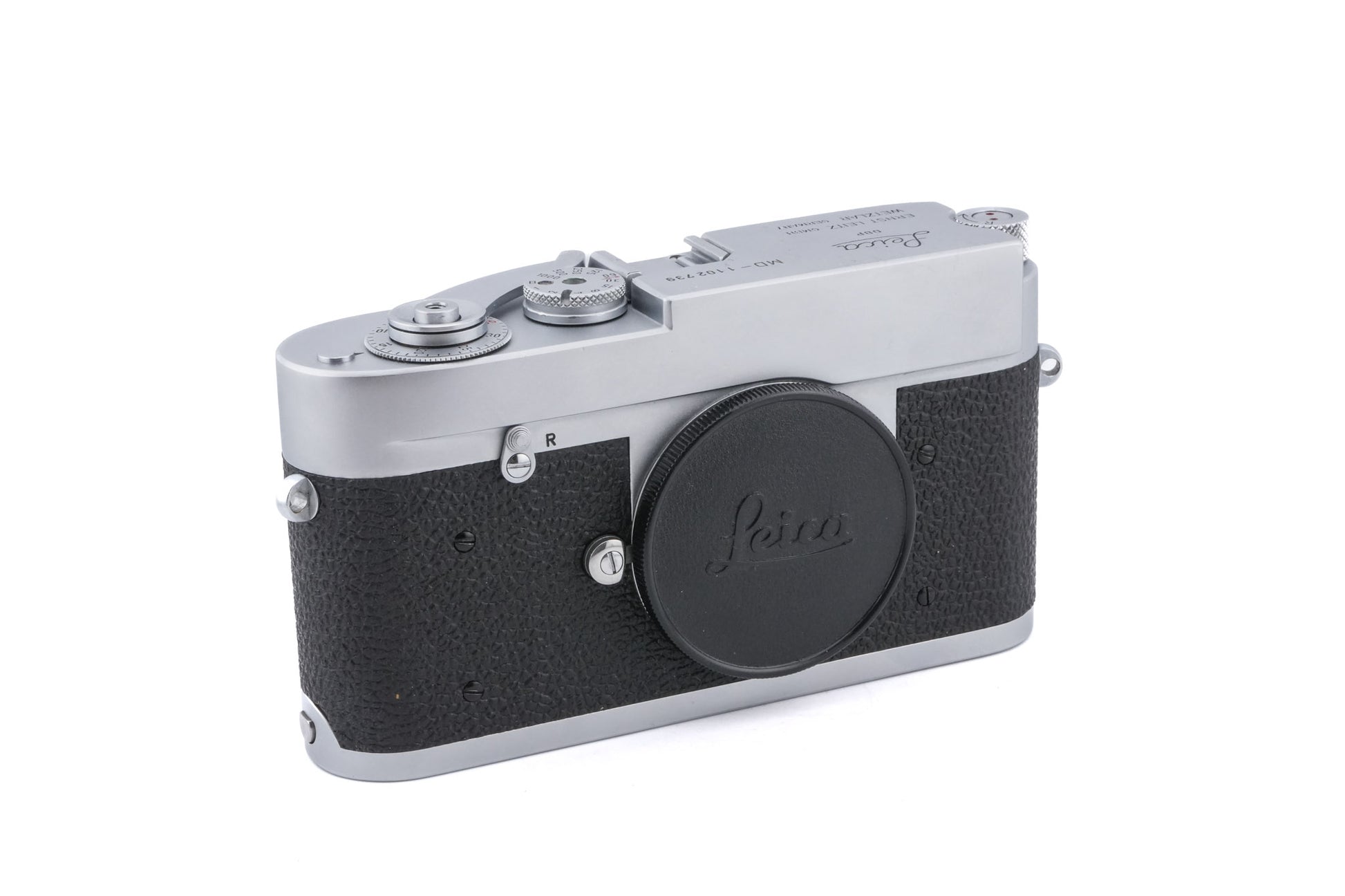 Manual focus M-mount 35mm camera introduced by Leica in 1964. The MD is a specialty camera intended for scientific applications such as photomicroscopy. The body resembles the M2 but lacks the viewfinder and rangefinder. This version of the camera has a standard baseplate that does not accommodate the 4mm plastic marker strips. Metal body available in silver (10101).
