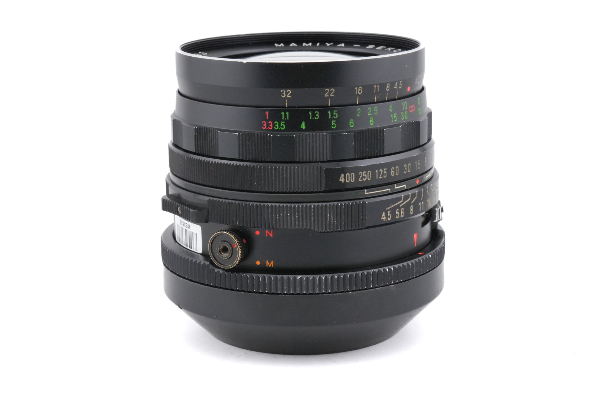 Manual focus wide-angle lens for Mamiya RB67 medium format SLR cameras made by Mamiya introduced in 1974. It has a 25mm equivalent focal length on 35mm full frame. It has a floating element that is moved by rotating the focus ring on the lens (normal focus done by the body), allowing for improved sharpness at various focus distances. It has in-between aperture stops. Metal body available in black.