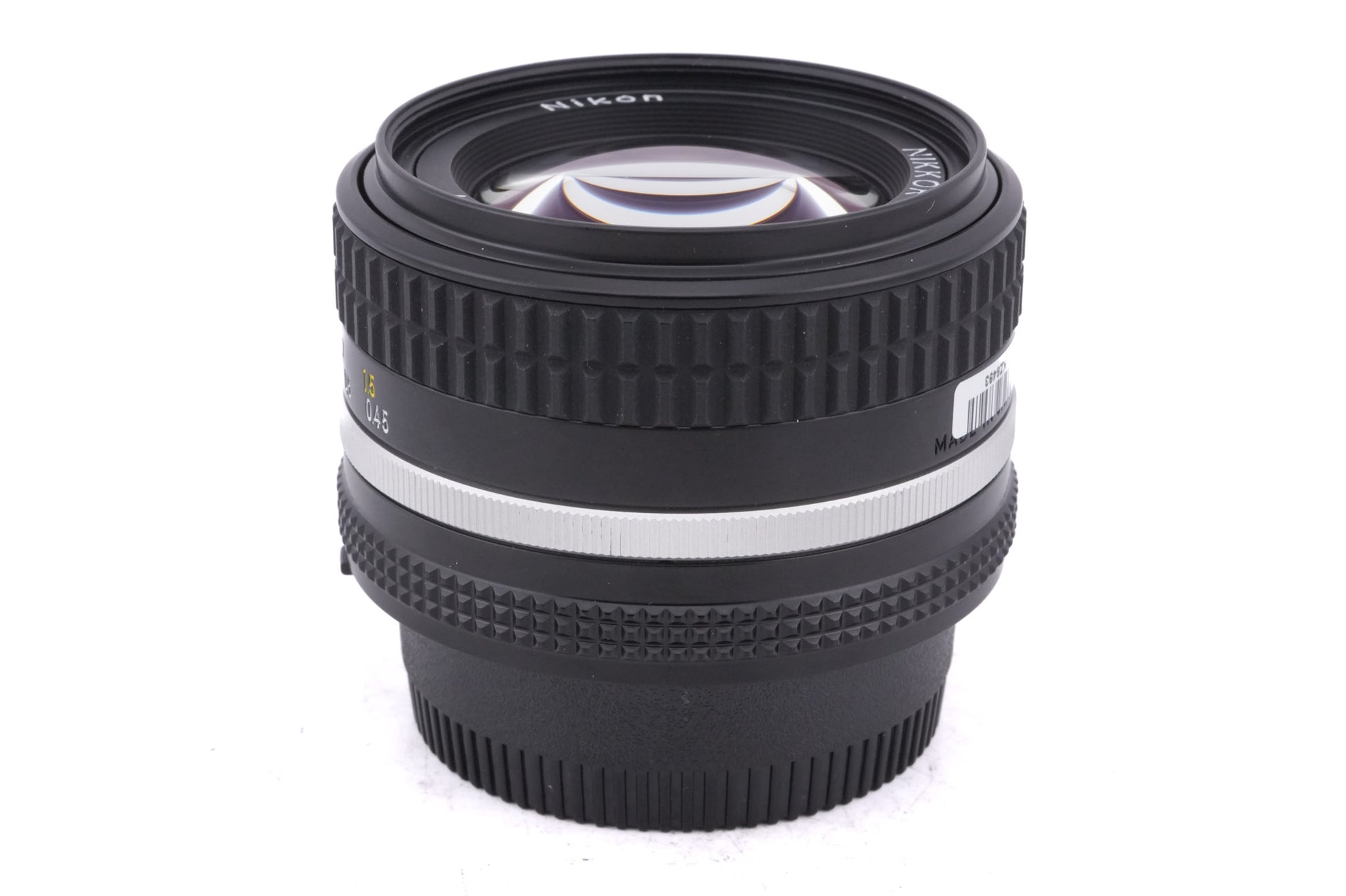 Manual focus normal lens made for F-mount 35mm SLR cameras by Nikon. It has the bunny ear metering prongs, AI ridge, and AI-S indent so it will meter properly on all manual Nikon cameras and will work with the advanced program modes of later models. Metal body available in black.