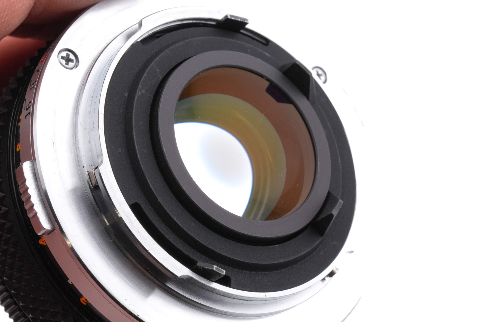 Manual focus normal lens made for OM-mount 35mm SLR cameras introduced by Olympus. It has its own aperture stop-down button and multi-coating. Metal body available in black.